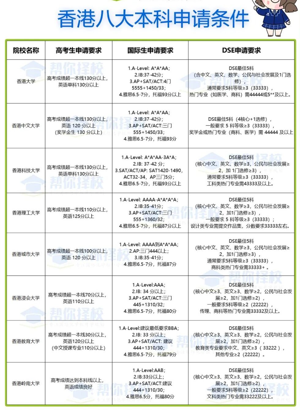 除了港前三,香港其他高校的本科申请条件也备受关注。为了让大家更全面了解,下面这张图详细整理了香港八大的本科申请要求,涵盖高考生、国际生、DSE考生不同群体,快来看看吧~