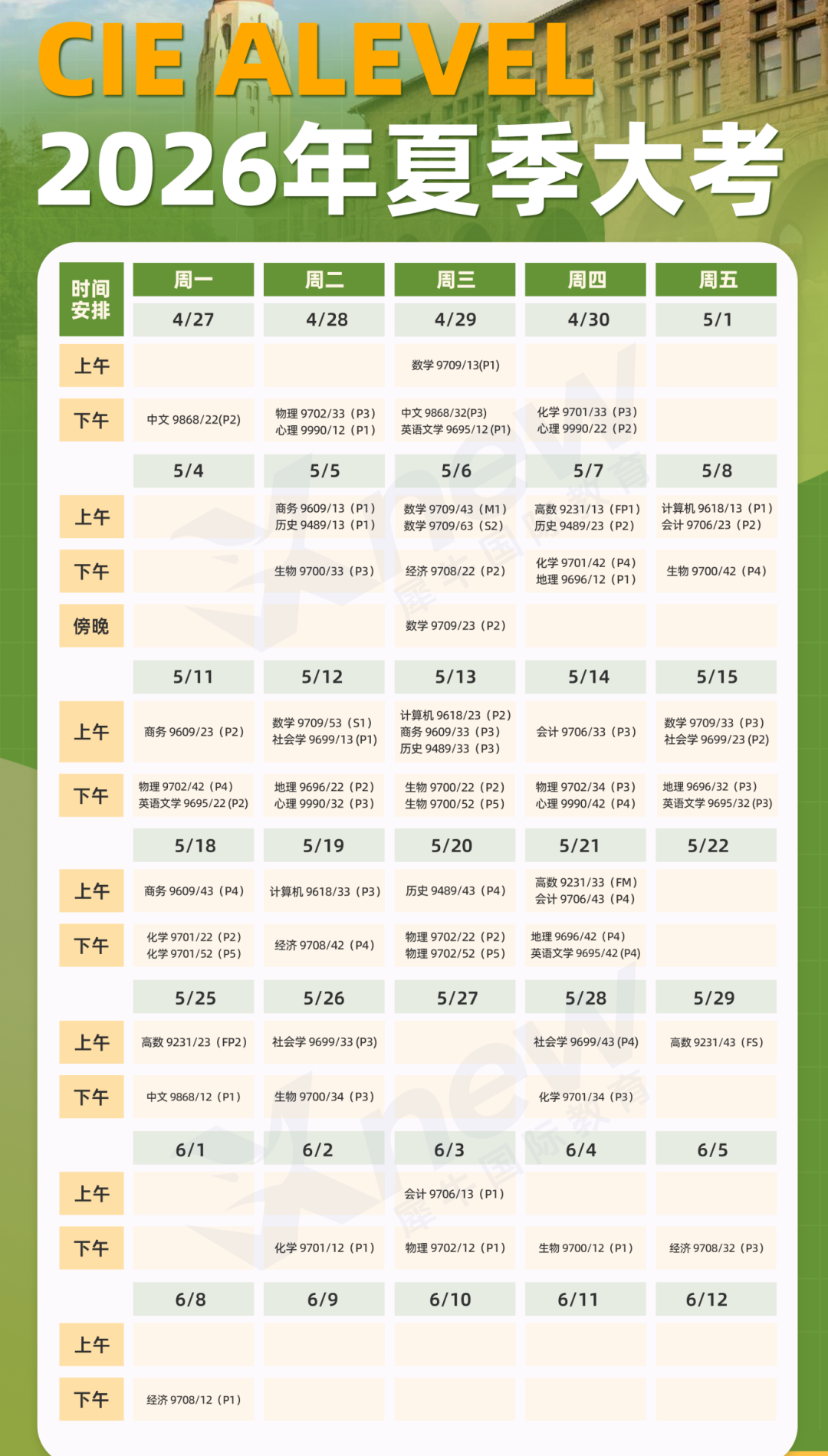 A-Level三大考试局分别是剑桥国际考试局(CAIE)、爱德思考试局(Edexcel)和牛津AQA考试局。2026年A-Level夏季大考时间是什么时候?