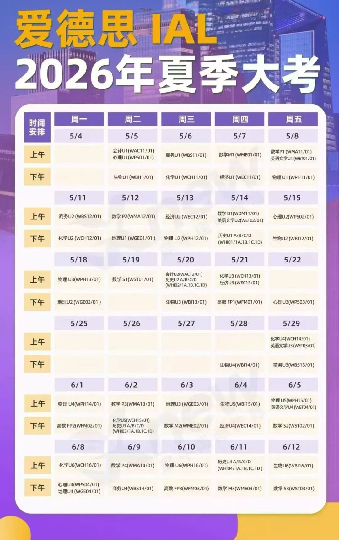 A-Level考试时间:2026年5月5日 - 2026年6月12日