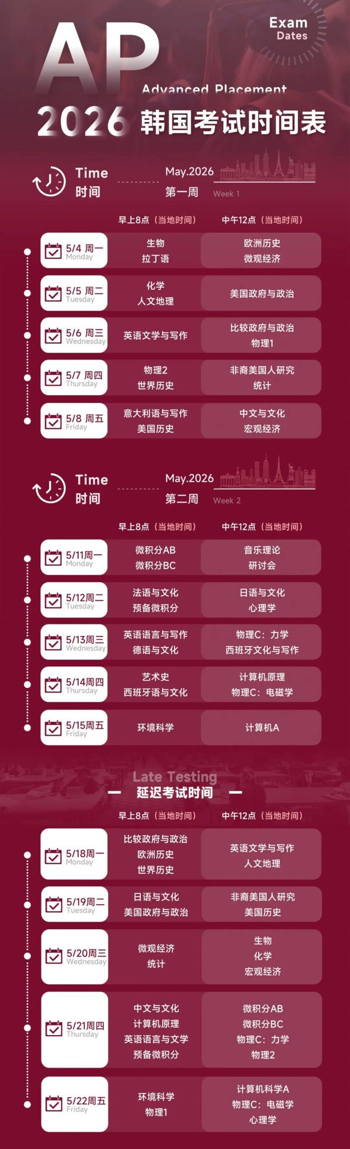 2026年AP考试将在5月4日-8日和5月11日-15日两周内以线下考试形式进行。