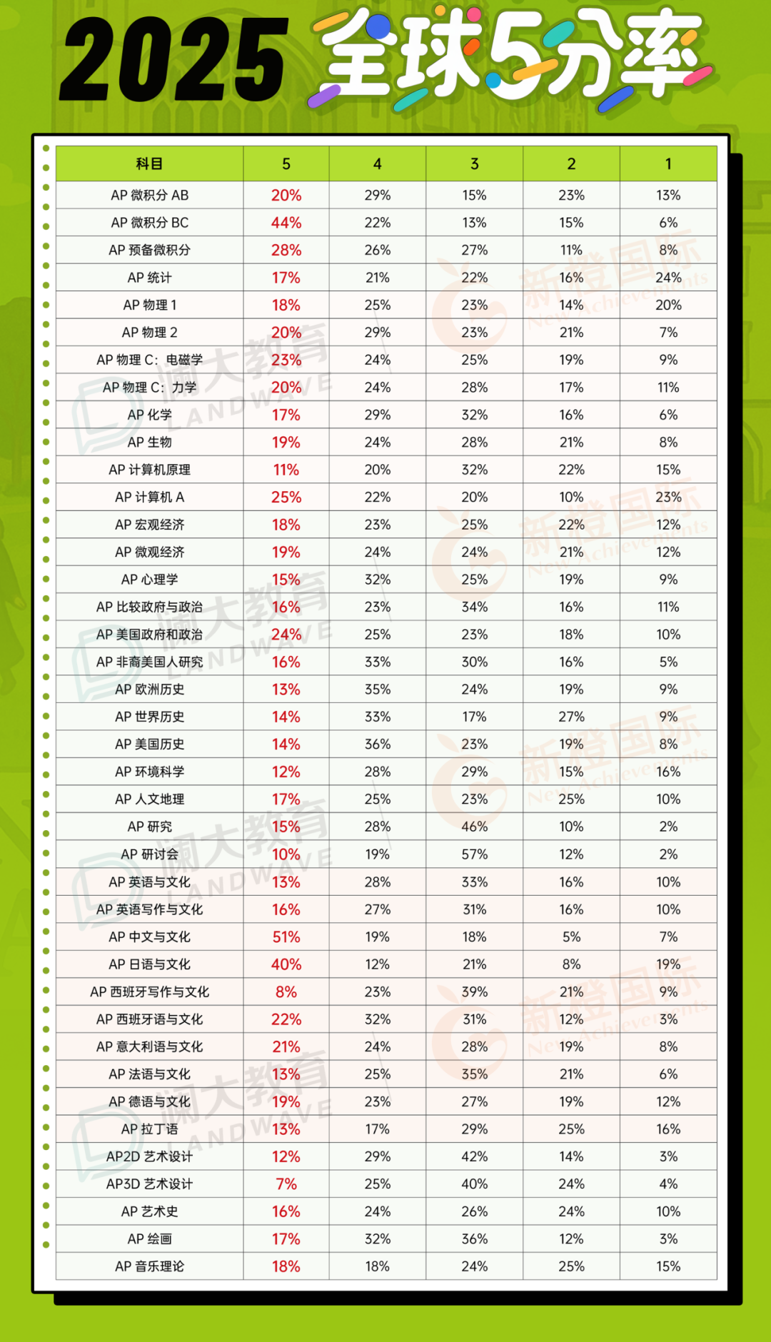 · 五分率:指参加该AP学科考试中拿到满分5分的考生比例