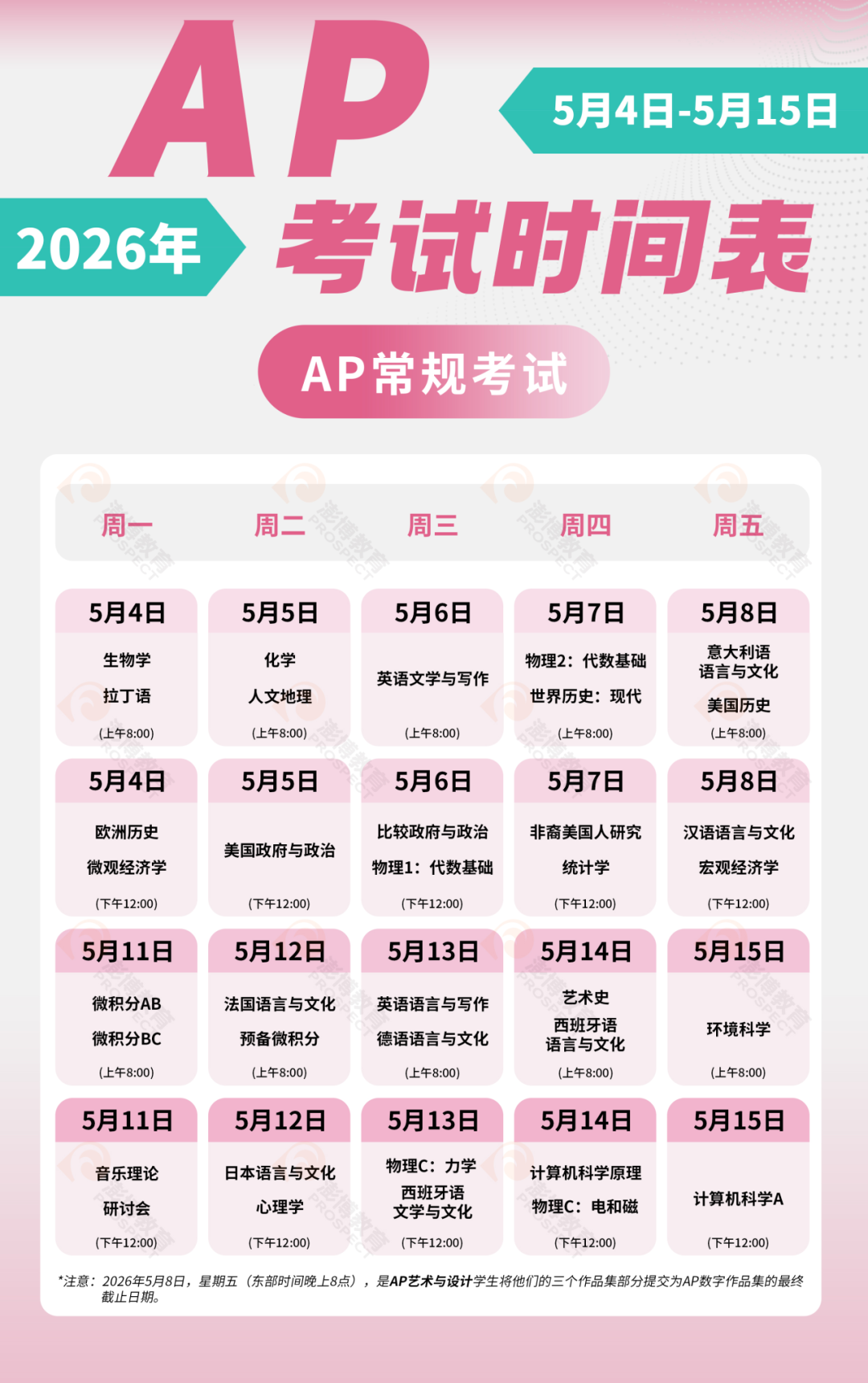 特殊科目作品提交截止:2026年4月30日(美东时间23:59),适用于AP Seminar、