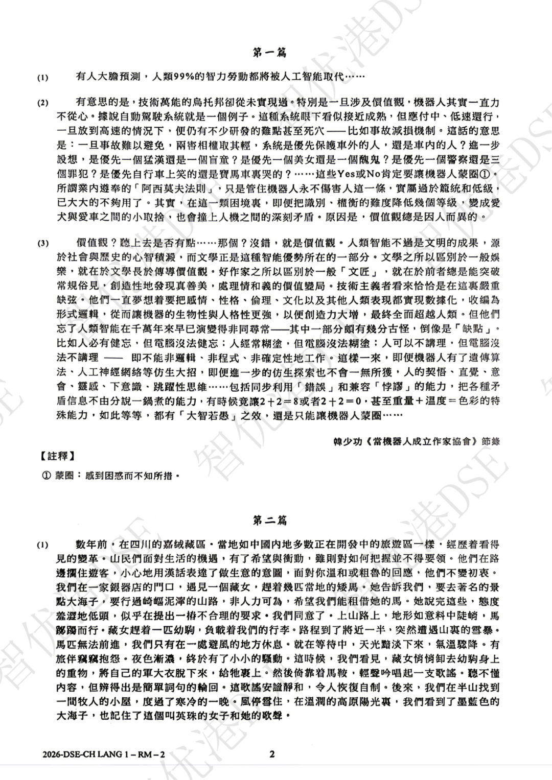 閱讀卷A部份探討珍珠奶茶的發展前景,B1及B2部份則分別圍繞經營YouTube頻道和旅行的意義。有考生認為今年試題較往年容易,A部分及B2部分的文章均貼近考生日常生活,用字亦相對淺白亦明,能夠掌握文章大意。不過她認為,B2部分設有3篇文章,令作答時間更加緊湊,指自己答畢試題後只剩3分鐘,不夠時間檢查。