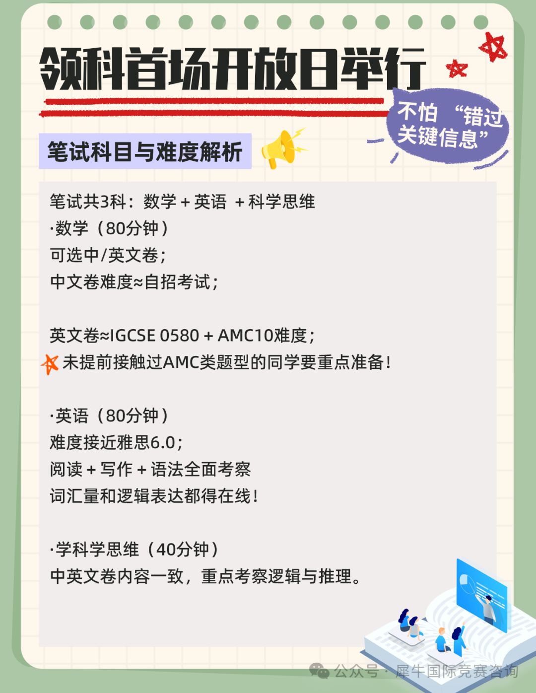 从历年入学考试情况来看,领科的选拔标准颇具特色:英语笔试不仅题量庞大、难度居高,写作部分更是明确要求运用比喻或拟人等修辞手法;而科学思维科目则注重跨学科知识的融合与综合素养的考查。
