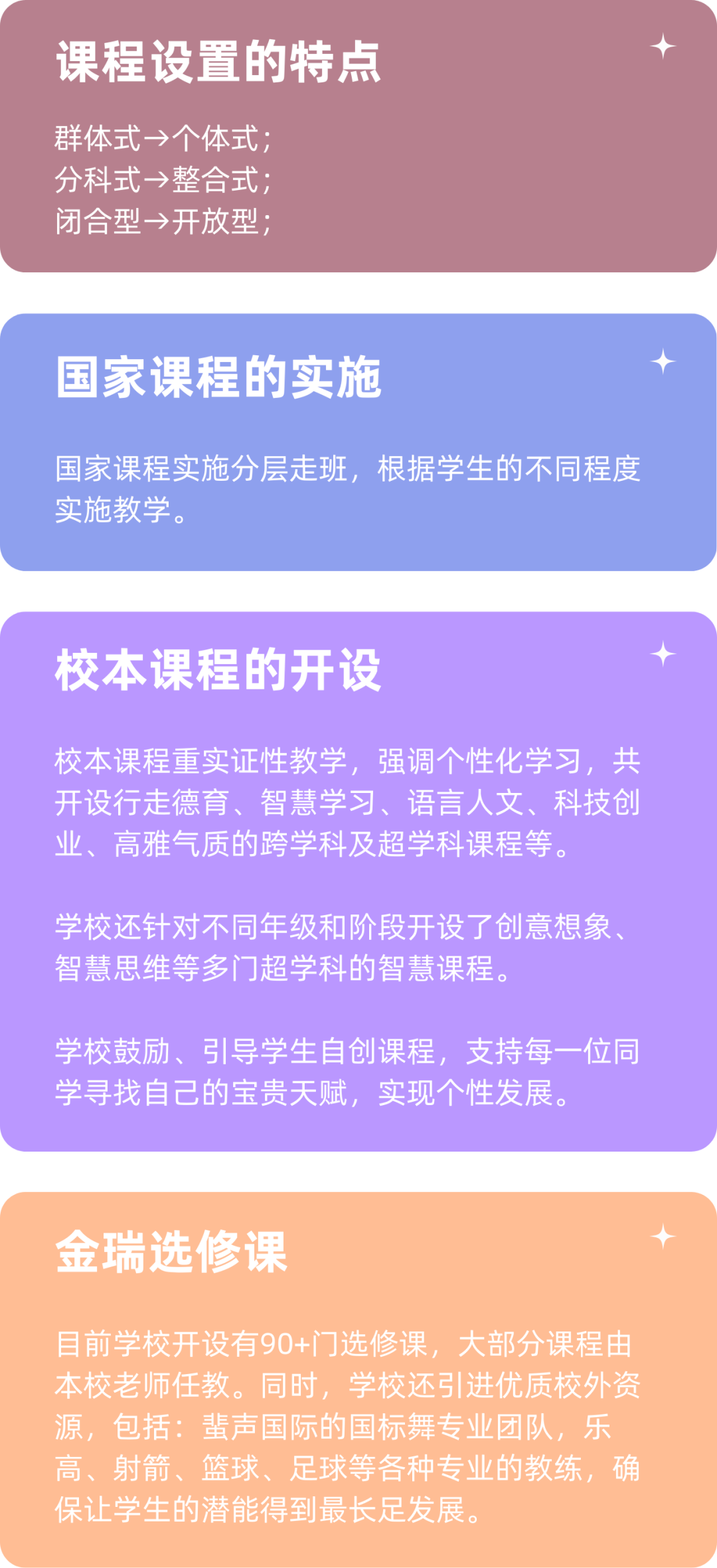 - 九年级课程,适当的时候,家长、学生和老师会进行一次深度交流和评估,学校根据结果会在 9 年级为学生安排既能满足其个性发展需求,又符合国家课程计划要求的配套课程。