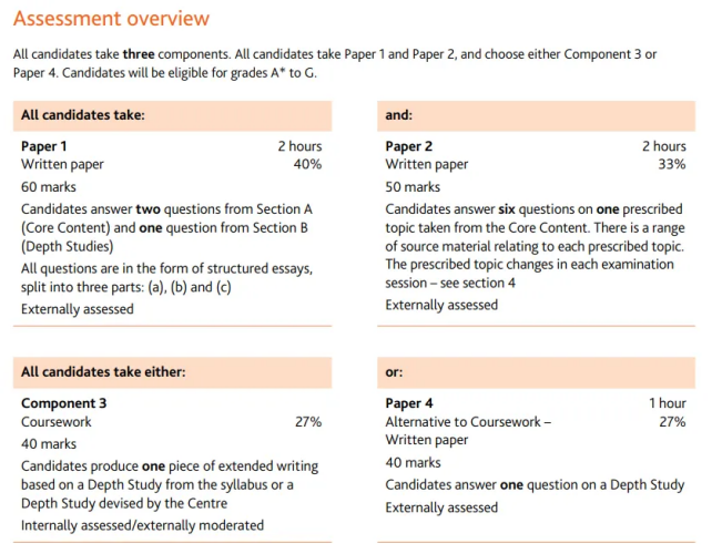 IGCSE历史包括三场考试,其中paper1和paper2为必考模块,Component 3和Paper 4任选其一。