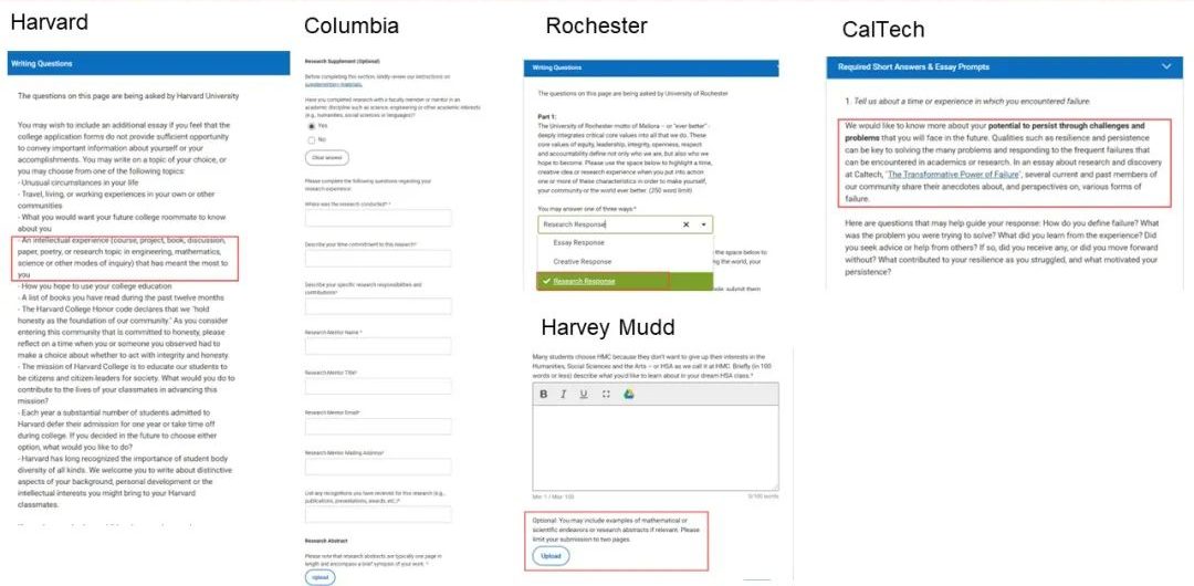 除了罗切斯特大学之外,哈佛大学,哥伦比亚大学,Harvey Mudd学院和加州理工的申请表格中都有需要回答学术研究的部分,小伙伴们不想都空着吧!