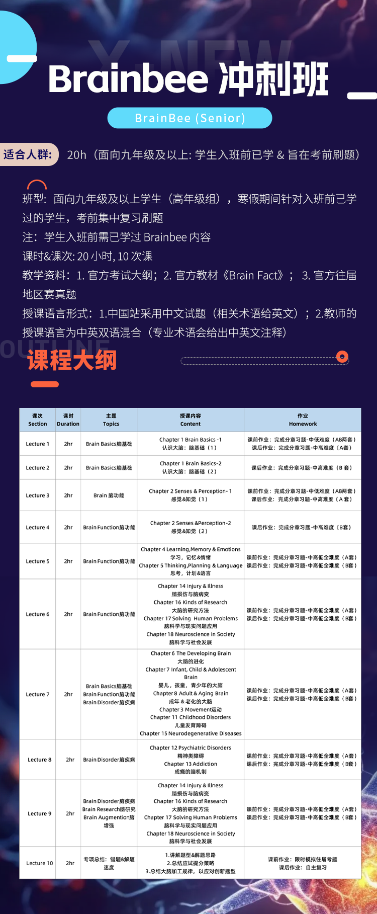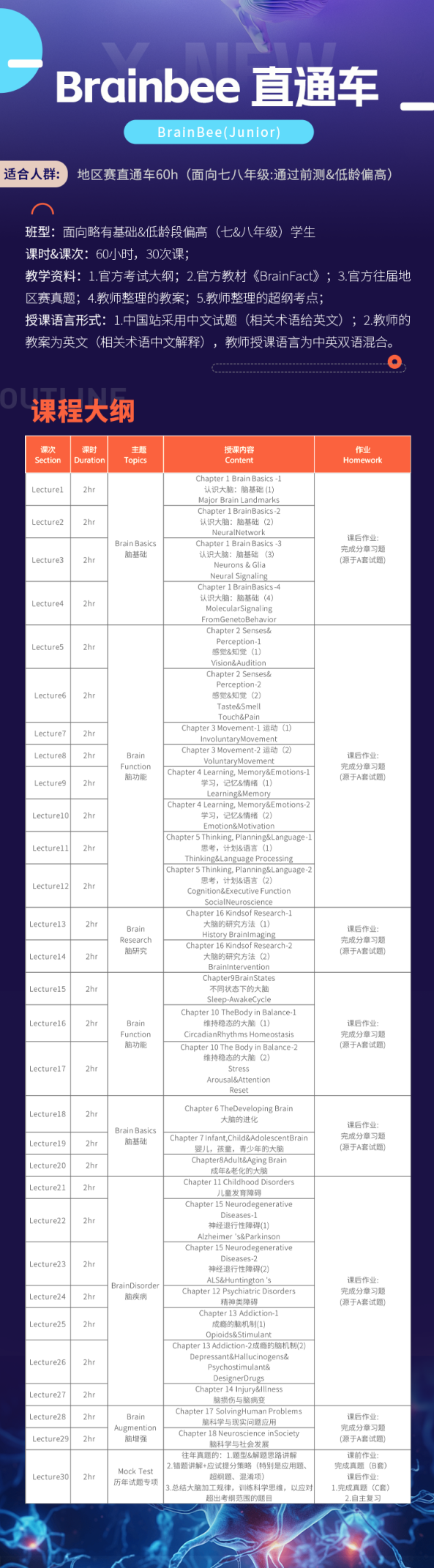 机构针对BrainBee脑科学竞赛开设了不同班型!包括BrainBee junior和Brainbee senior培训课程,适合不同年级、不同基础的学生学习。