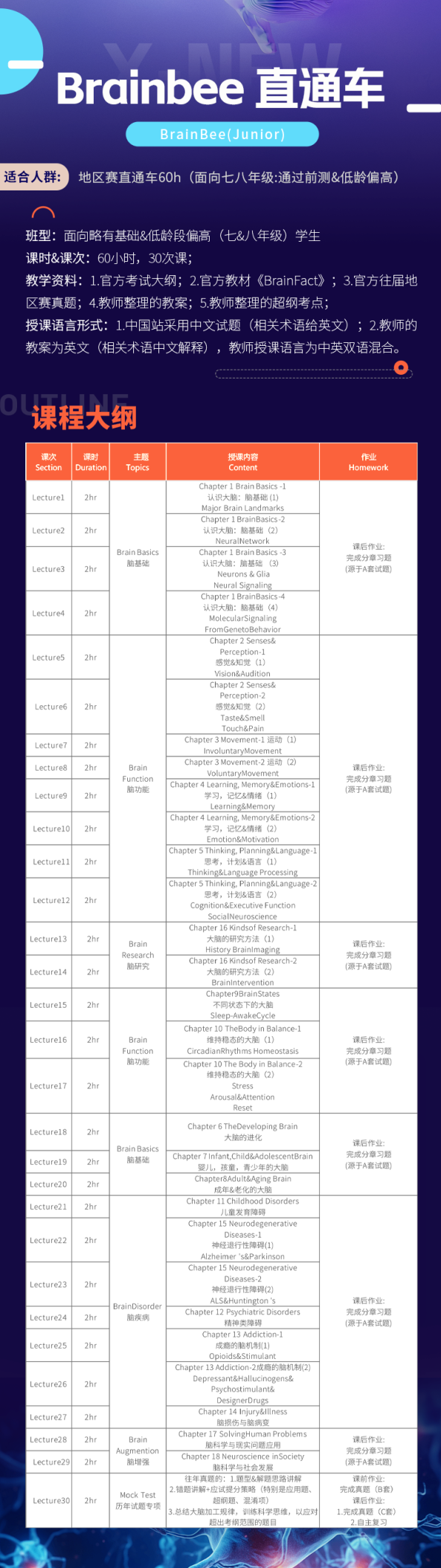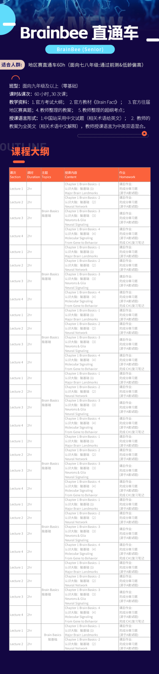 机构针对BrainBee脑科学竞赛开设了不同班型!包括BrainBee junior和Brainbee senior培训课程,适合不同年级、不同基础的学生学习。