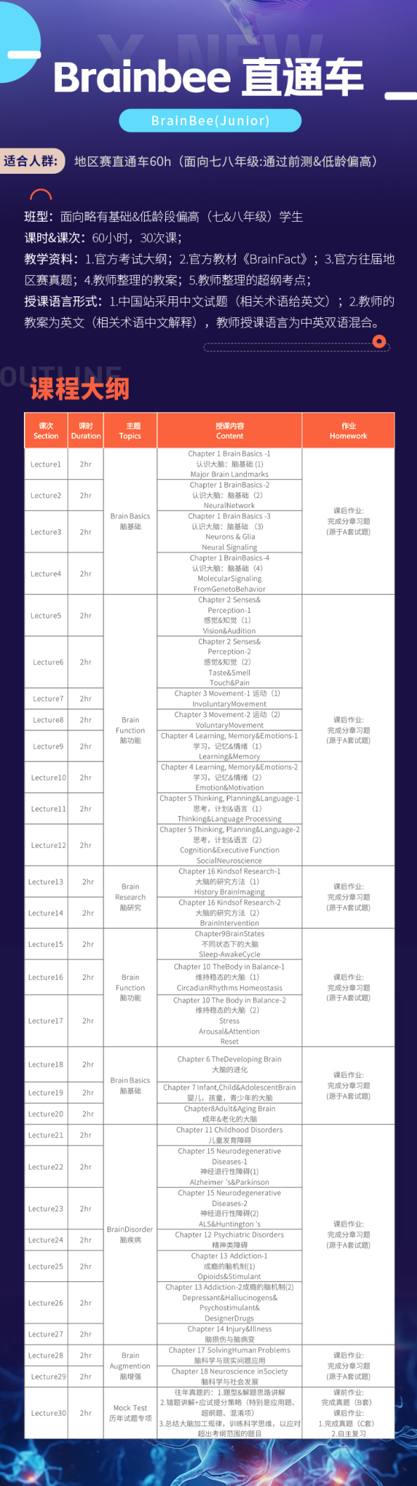 机构针对BrainBee脑科学竞赛开设了不同班型!包括BrainBee junior和Brainbee senior培训课程,适合不同年级、不同基础的学生学习。