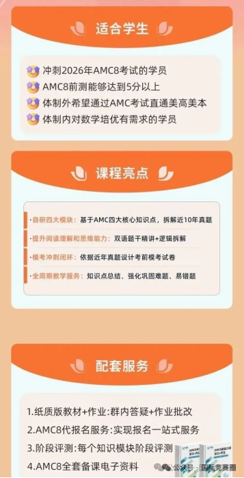 机构国际教育根据不同基础的孩子设立不同的班级,秋季课程有Pre-AMC8课程,AMC8基础班,AMC8强化班及AMC8冲刺班~