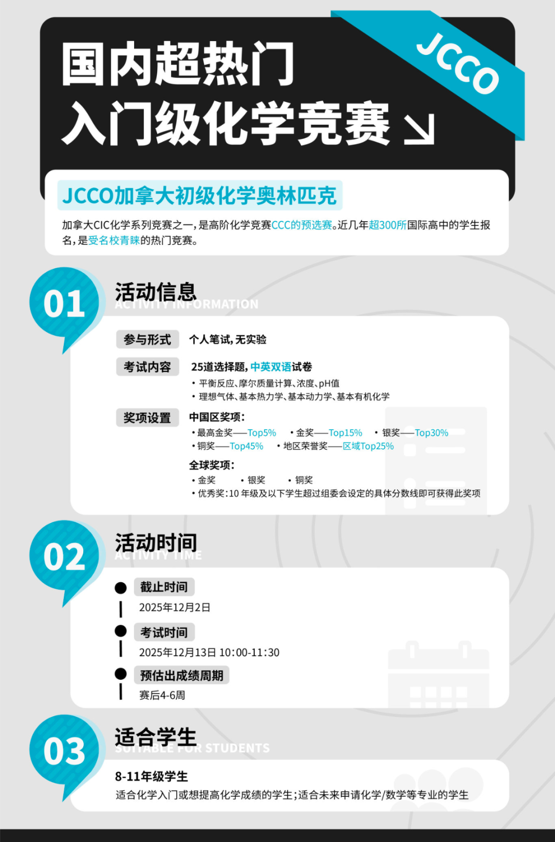 接下来这几个化学竞赛,适合8年级、9年级、10年级、11年级的同学分阶段去准备,大家也可以结合自己的兴趣、时间安排以及目标专业进行筛选。