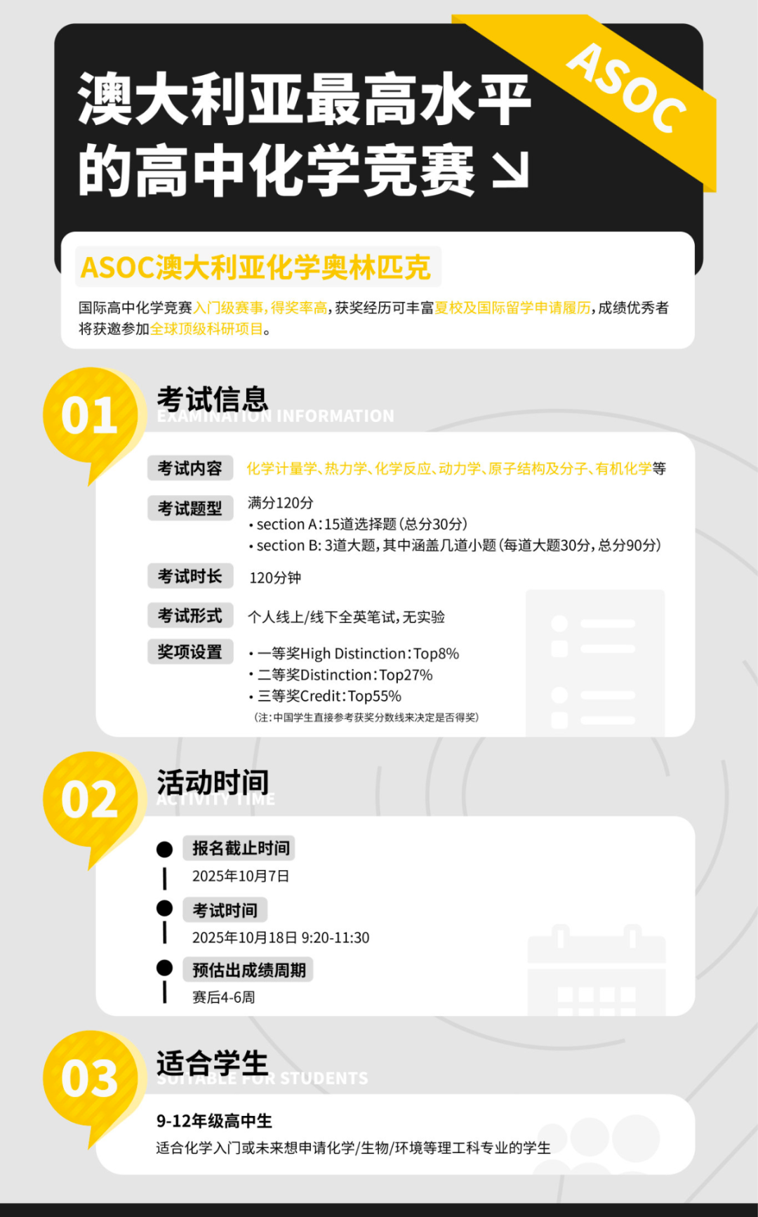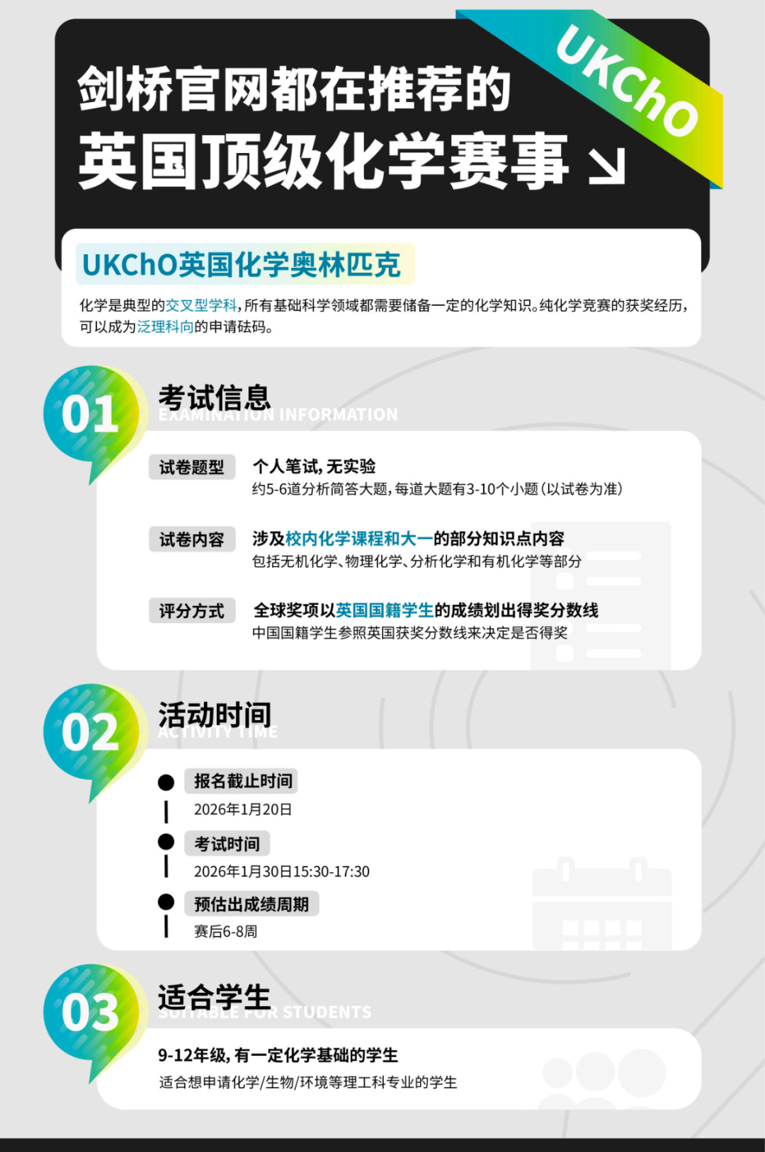 目标海外名校本科申请,化学生想参加对应的化学竞赛,实际上有非常多选项,但如何结合难度和能力做好参赛规划?无论是美本申请还是英港本科,招生官不仅重视学术能力,同时还要看到学生能够将热爱的专业由浅入深地进行探索、学习和应用;