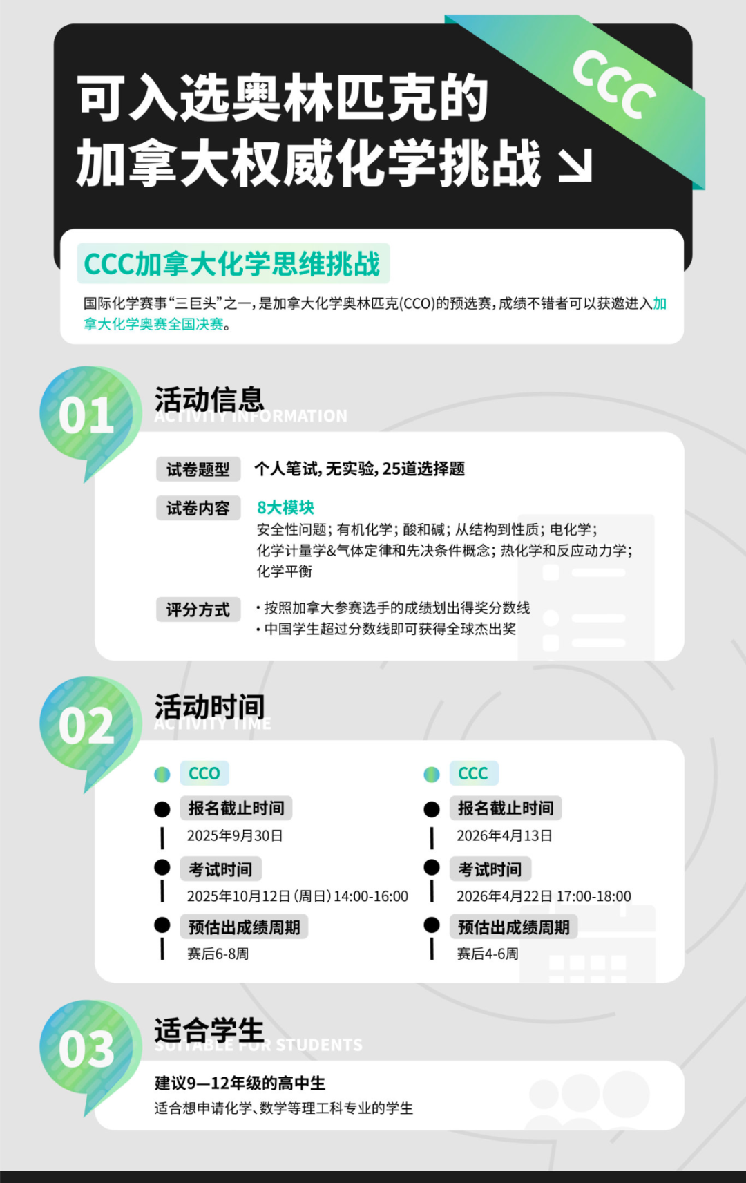9-10年级学生需要重视化学竞赛的正规性和含金量。这个阶段学习化学竞赛知识和课内提升,需要掌握化学定量计算、反应规律与有机基础,通过CCC竞赛提升“知识应用与多步解题能力”,为更高阶的化学考试/科研竞赛做铺垫。
