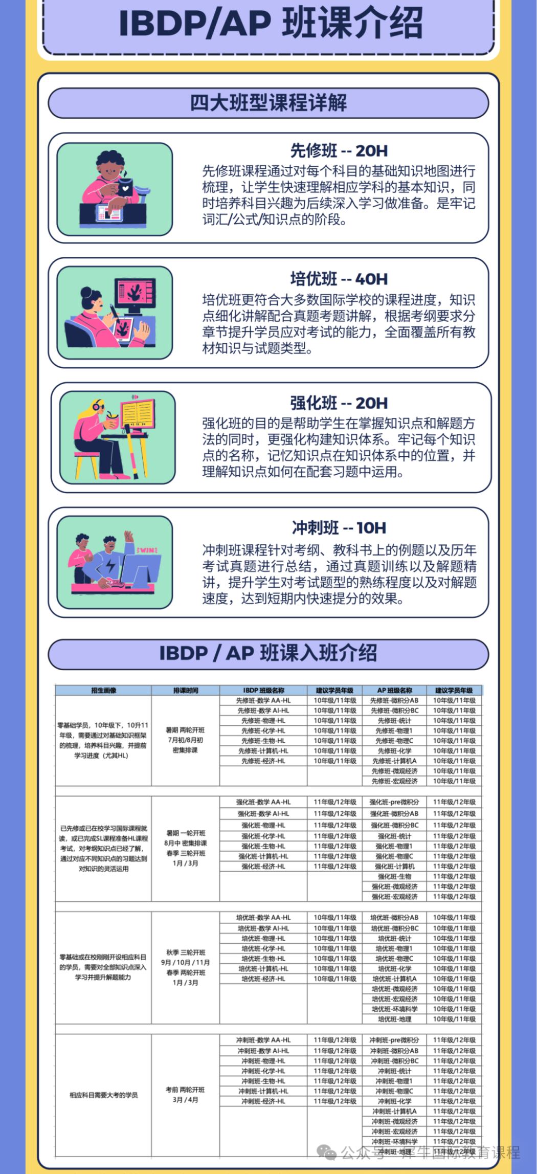 根据前测成绩,学生将被精准分到不同班型:Pre-AMC8班(基础夯实)、全程班(系统学习)、强化班(能力提升)、冲刺班(高分突破)