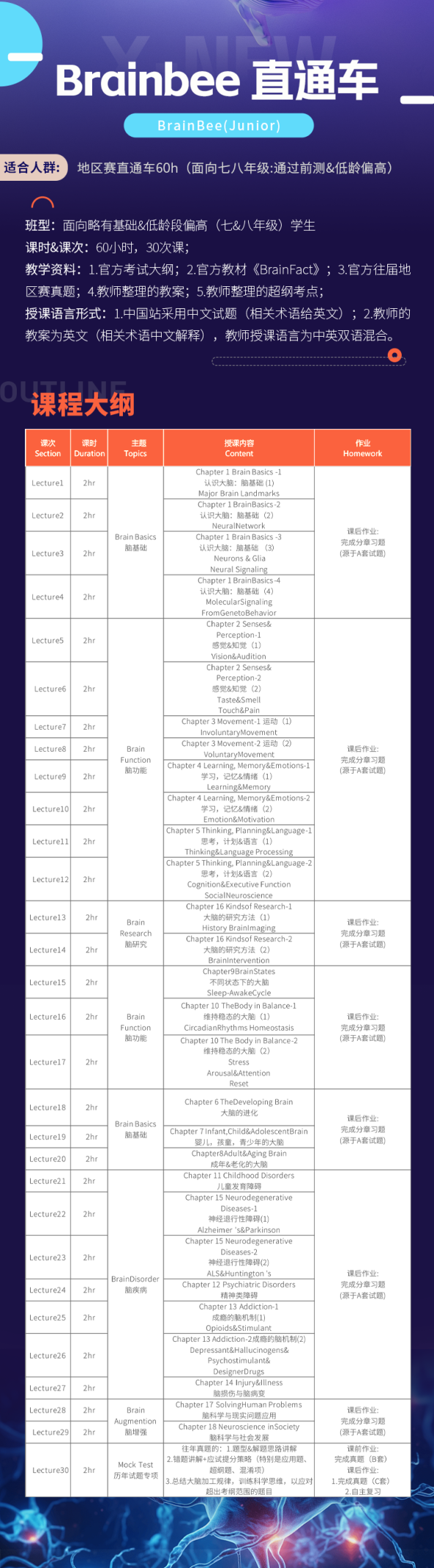 机构聚焦BrainBee脑科学竞赛设置brainbee课程多元班型,涵盖BrainBee Junior课程与 BrainBee Senior课程,适配各年级、不同基础层次的学生。