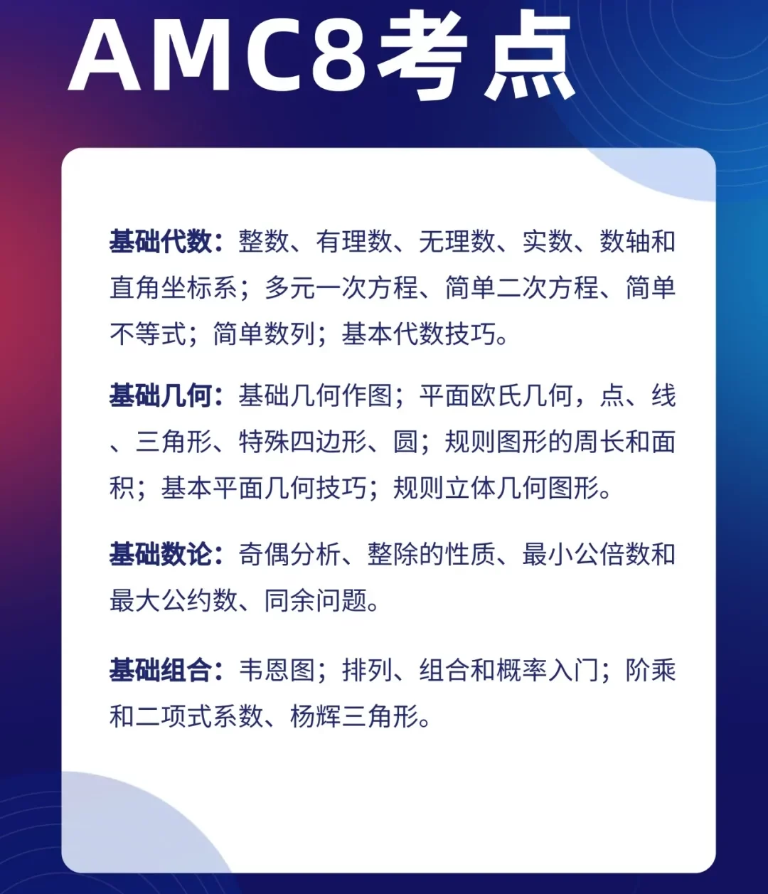AMC8数学竞赛考试内容主要是:基础代数、基础几何、基础数论和基础组合四大板块!