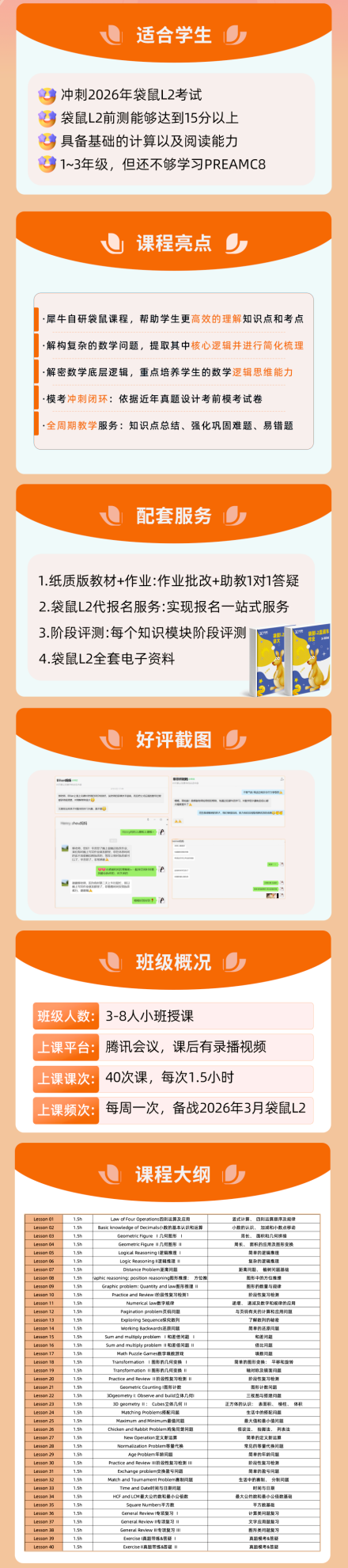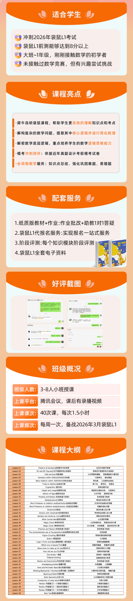 针对低龄学生,开设了袋鼠数学竞赛L1-L2培训课程班,提升学生数学思维逻辑,帮助学生拿下袋鼠数学竞赛金奖、超金奖。