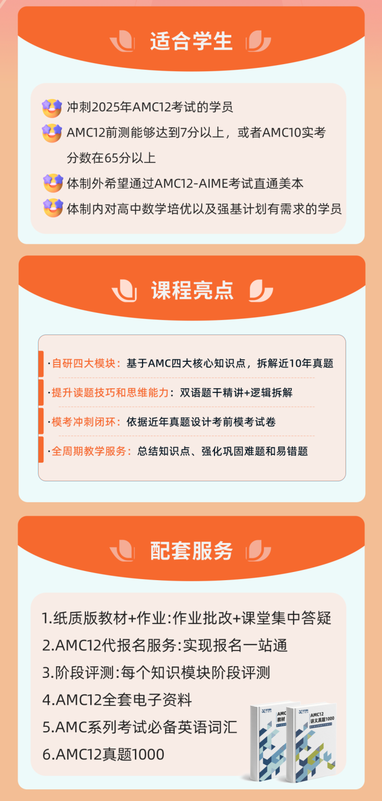 针对 AMC12 备赛学生的不同基础与目标,机构设计了适配性极强的培训课程,班型灵活可选,线上线下同步开班,无论你是补基础、破难点还是冲高分,都能匹配对应学习场景: