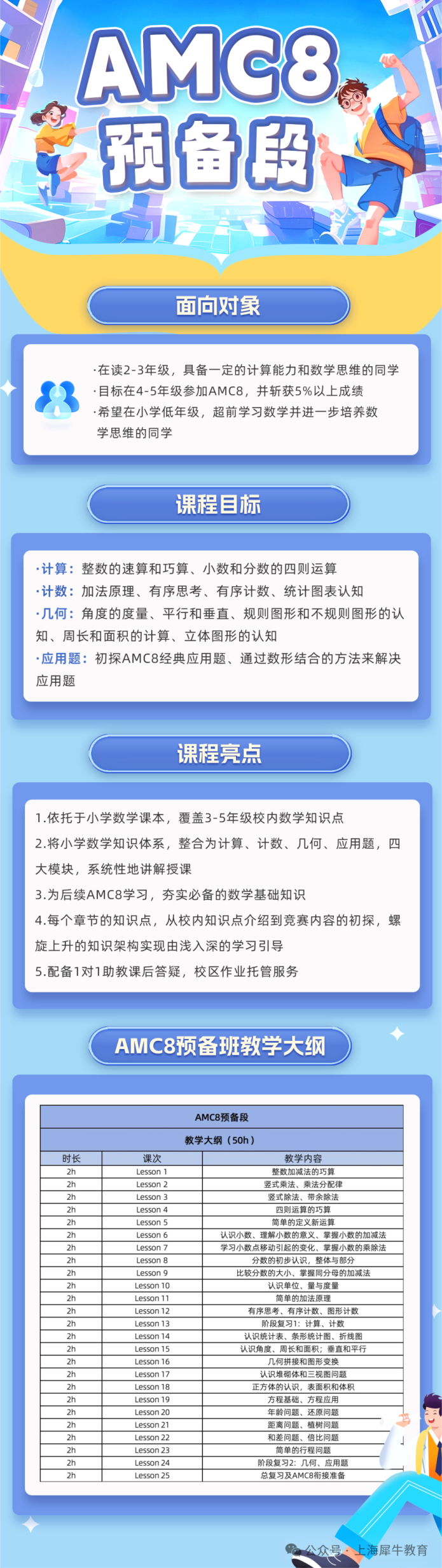 机构开设了AMC8预备段、Pre-AMC8,AMC8基础班,强化班,冲刺班等不同类型的竞赛培训课程。