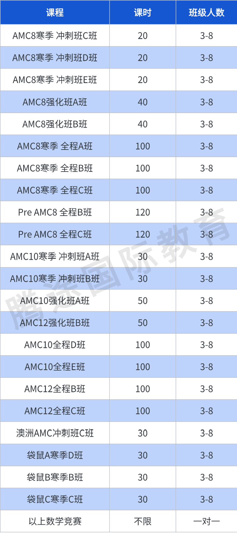 机构针对不同基础程度的孩子,开设了不同进度的数学竞赛培训,如全程班、强化班、冲刺班,线上线下同步授课。覆盖AMC8、AMC10、AMC12、澳洲AMC、袋鼠、思维100、AIME等各项赛事。
