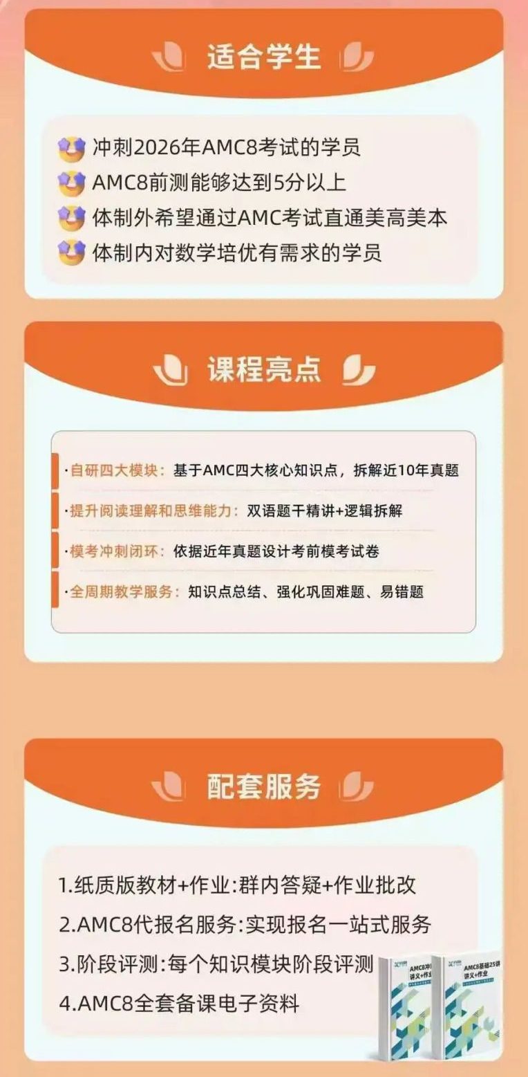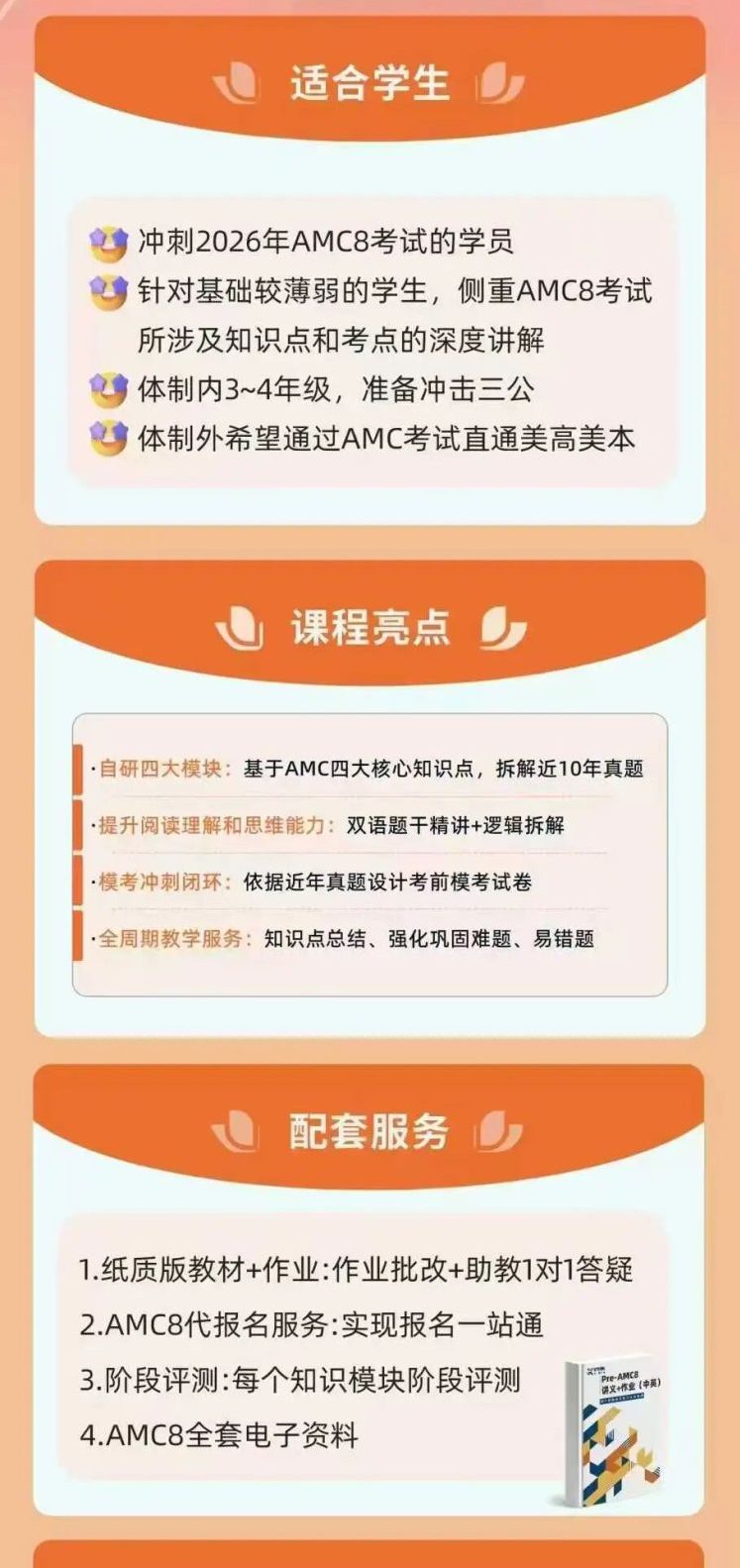 机构AMC8培训课程,线上线下全面开课,夯实基础—强化训练—模考冲刺,三段式学习助力孩子拿下前1%,可文末扫码咨询课程