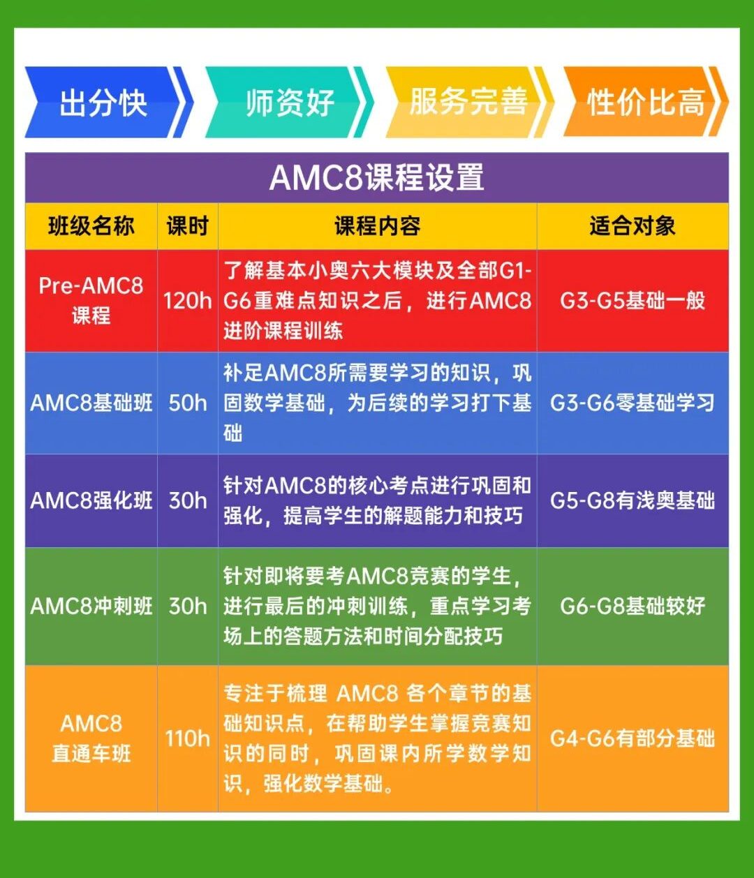 机构开设Pre AMC8全程班、AMC8基础班、 AMC8强化班、AMC8冲刺班、AMC8全程班多种班级,根据前测成绩精准入班,满足不同基础学生的上课需求。
