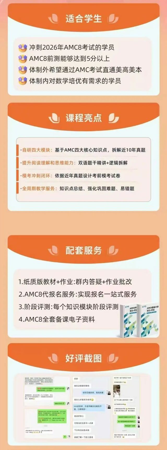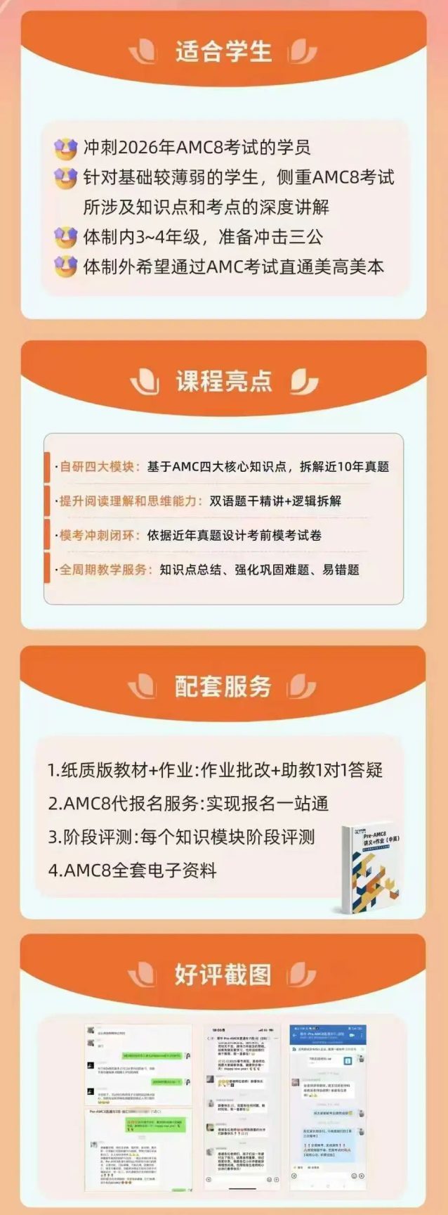 机构开设AMC8竞赛培训班,分为preAMC8全程班和AMC8全程班,适合不同年级、不同基础的学生备考学习,搭配机构团队自研的教材讲义,紧扣竞赛大纲,带同学们冲刺AMC8奖项