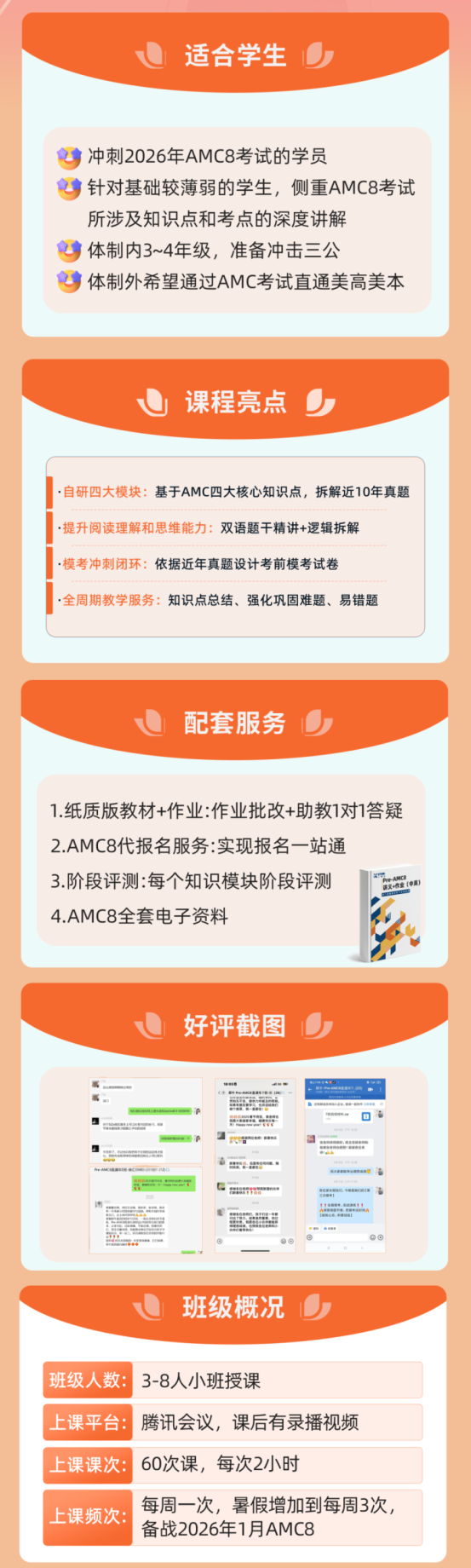 AMC8竞赛是低门槛高回报的入门级国际数学竞赛,每年举办一次,海内外参赛者数不胜数。距离26年AMC8开赛不足两个月,想高效冲奖,机构AMC8专项辅导可以重点了解一下,新加坡国立大学导师在线亲授,直击竞赛核心考点,帮你科学提分,稳稳冲佳绩。