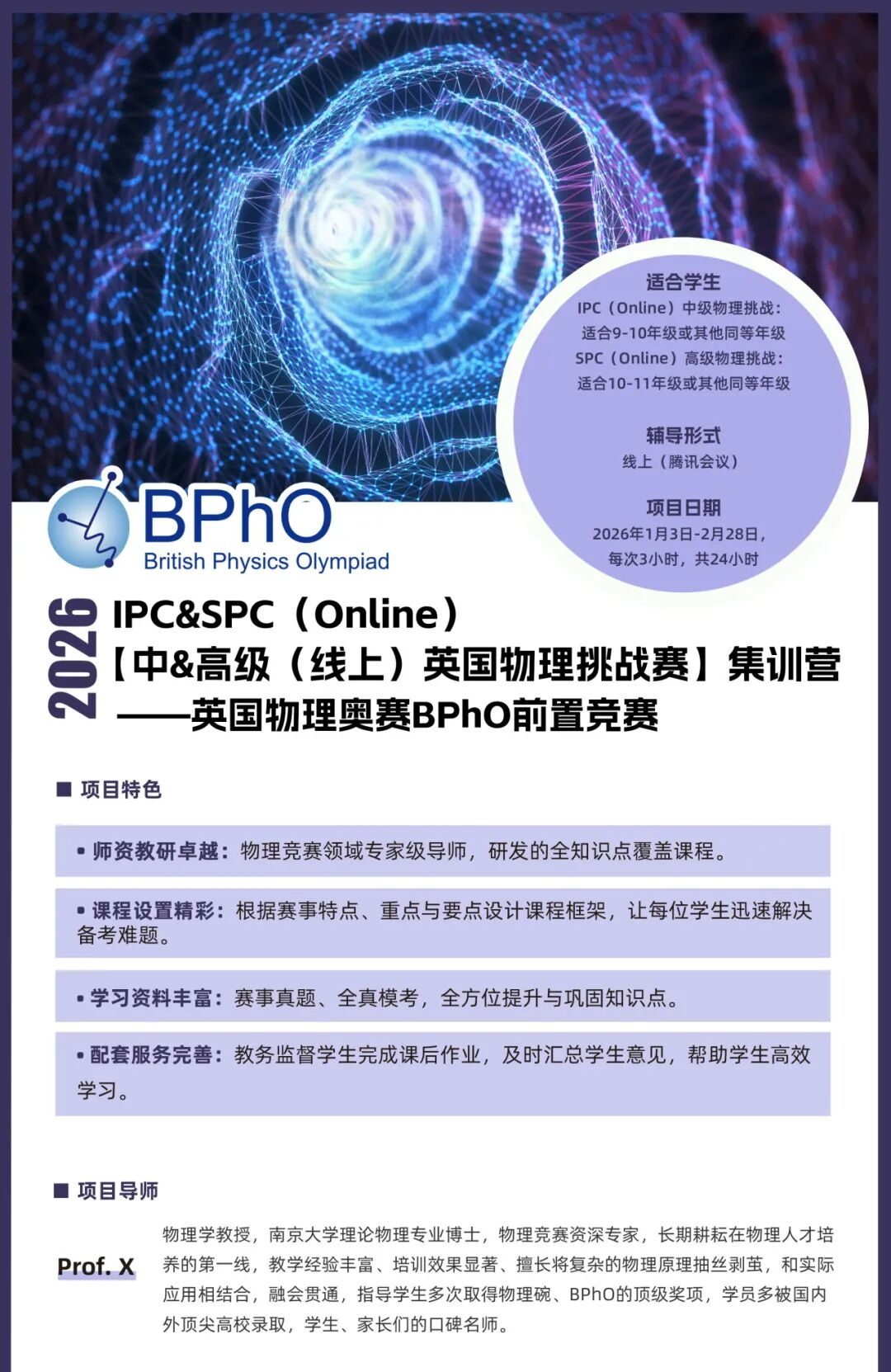 当BPhO报名资格从“符合条件即可”变为“奖项优先分配”时,物理竞赛的竞争已从单一考试转变为全年规划、阶梯晋级的系统工程。为了帮助大家更好更系统地学习理解,机构设计了IPC&SPC(Online)整个系列课程,更有经验丰富的老师带大家更好的刷题拆解竞赛。