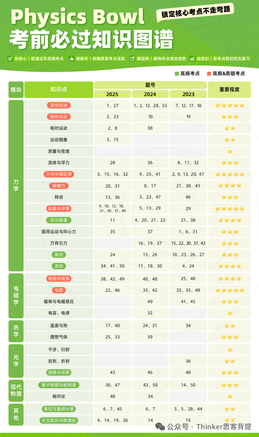 机构物理竞赛教研组整理了物理碗近三年考点知识图谱,涵盖全部知识点、高频&易错考点,以及其在考试中的出题位置👇