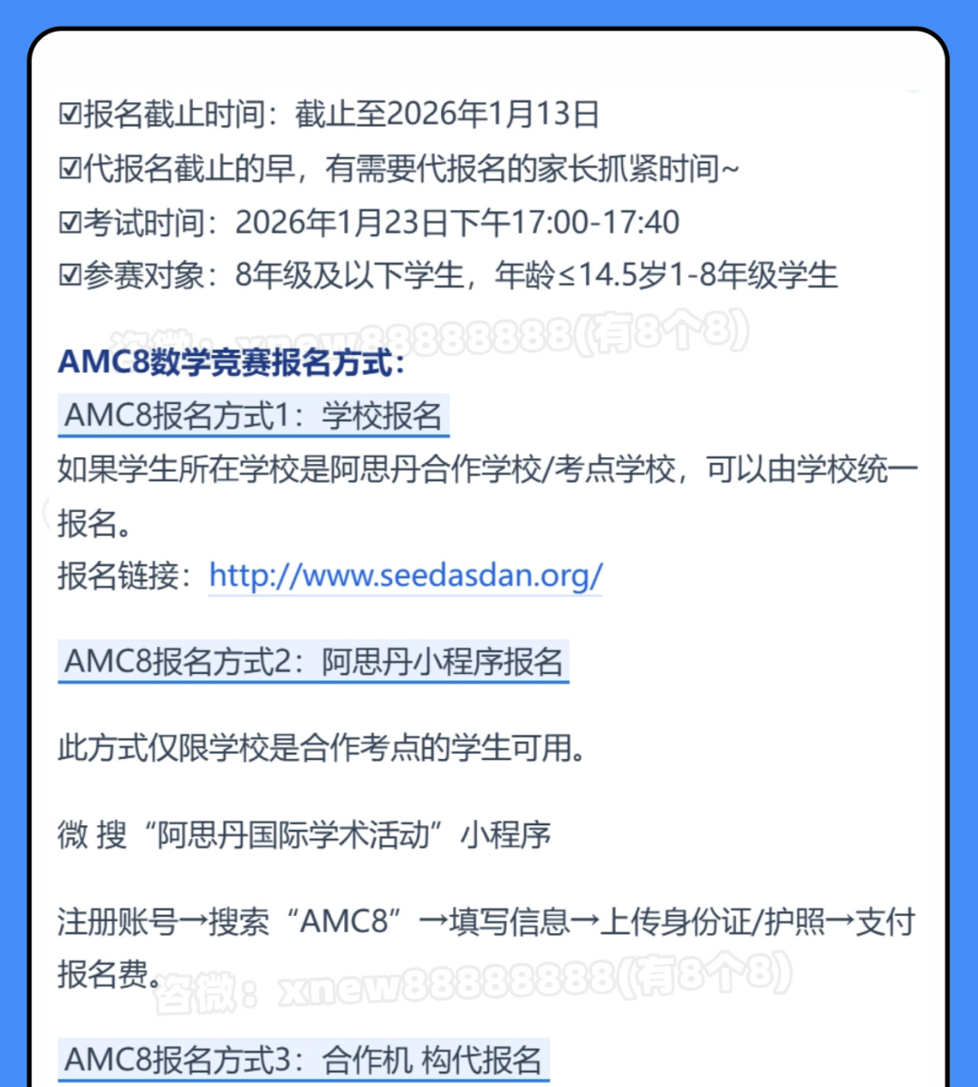 2026年AMC8数学竞赛报名时间即将截止!一文攻克报名流程! 2025-12-13 16 预计阅读需要1分钟 2026年AMC8数学竞赛报名通道即将关闭!! 作为全球超30万学生参与的权威数学赛事,AMC8数学竞赛不仅是8年级及以下学生展现数理天赋的舞台,更是小升初择校、美高申请的“学术硬通货”。 当前!2026年AMC8数学竞赛报名进入倒计时,不少家长仍在为“怎么报”“报完怎么备”发愁,本文将一站式解决所有核心问题,助孩子顺利踏上竞赛之路。 2026年AMC8数学竞赛报名时间、流程一图攻克~具体详情如下: 【竞赛报名/项目咨询+微信:mollywei007】 本文由 Molly 转载发布在 国际教育联盟平台,版权归原作者所有,如有侵权,请直接联系微信进行处理。