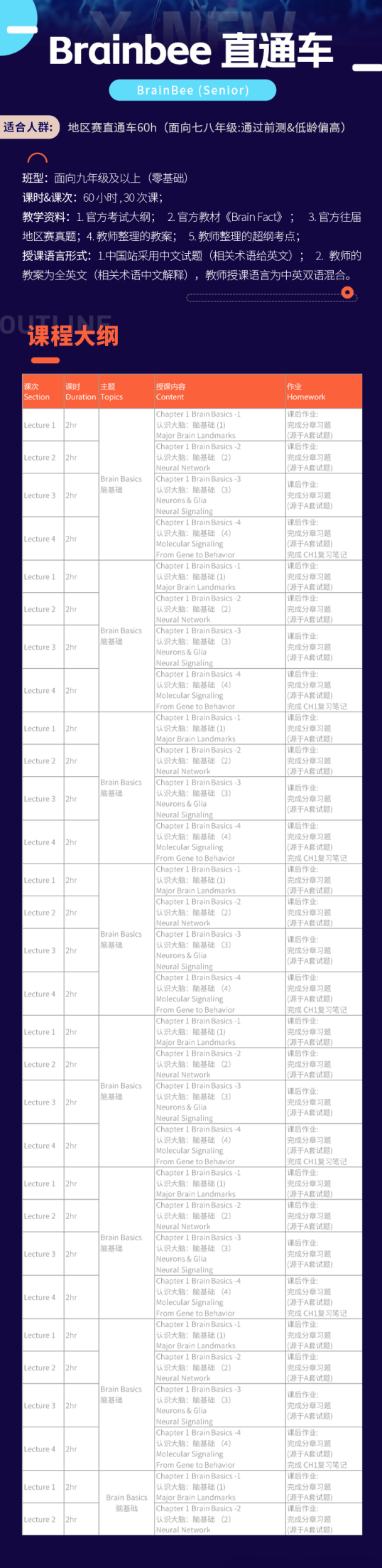 Brain Bee脑科学活动增设低龄组Brain Bee,接受5-8年级的学生报名参加。中国BrainBee脑科学活动采用地区、全国、国际共三级进阶模式。