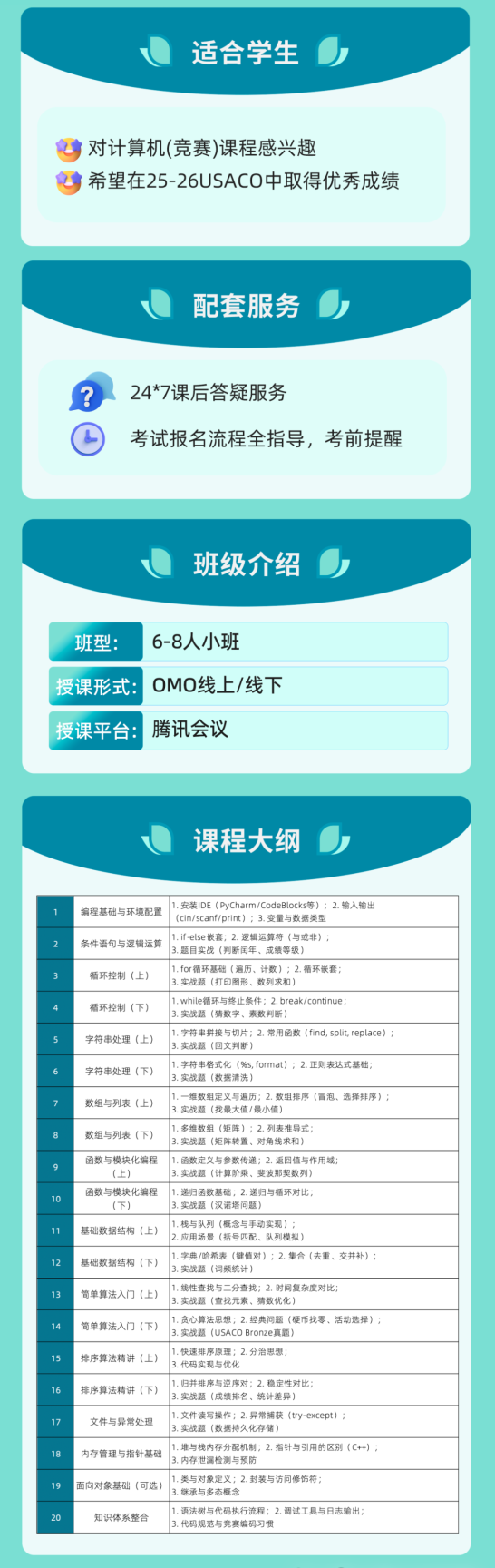 机构为帮助参加USACO赛事的同学顺利晋级下一个赛段,机构开设的USACO铜升银、银升金、金升铂金精品课程,小班课和一对一辅导,线上线下同步教学,上海浦东、徐汇、黄浦、闵行4地线下授课,课程详情扫码咨询。