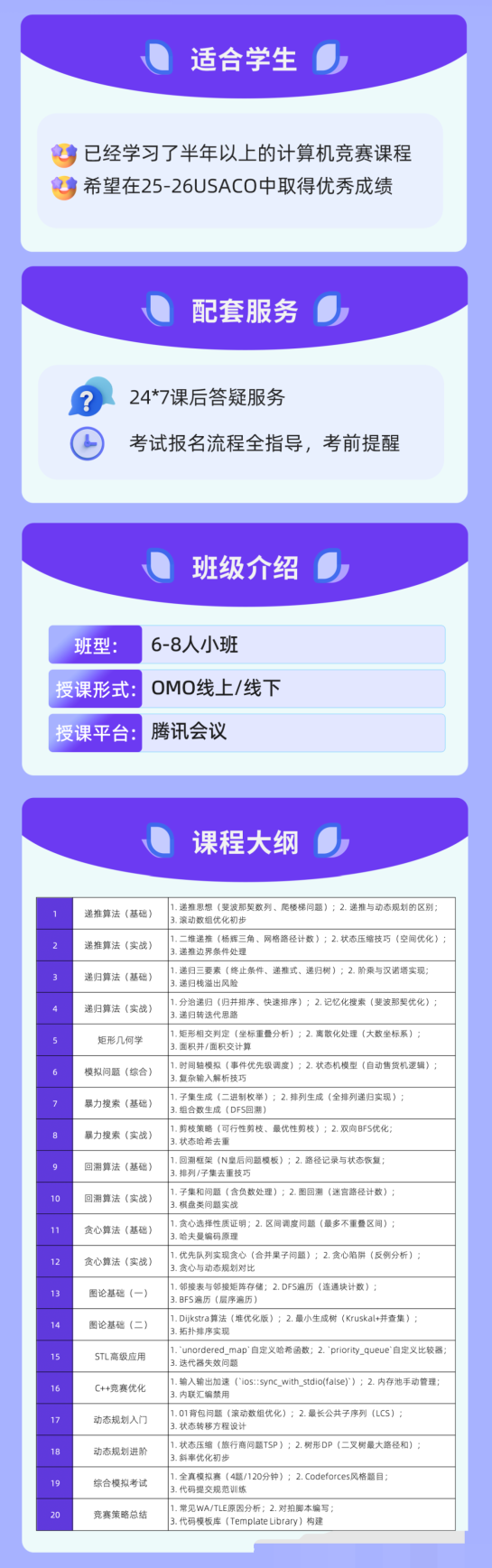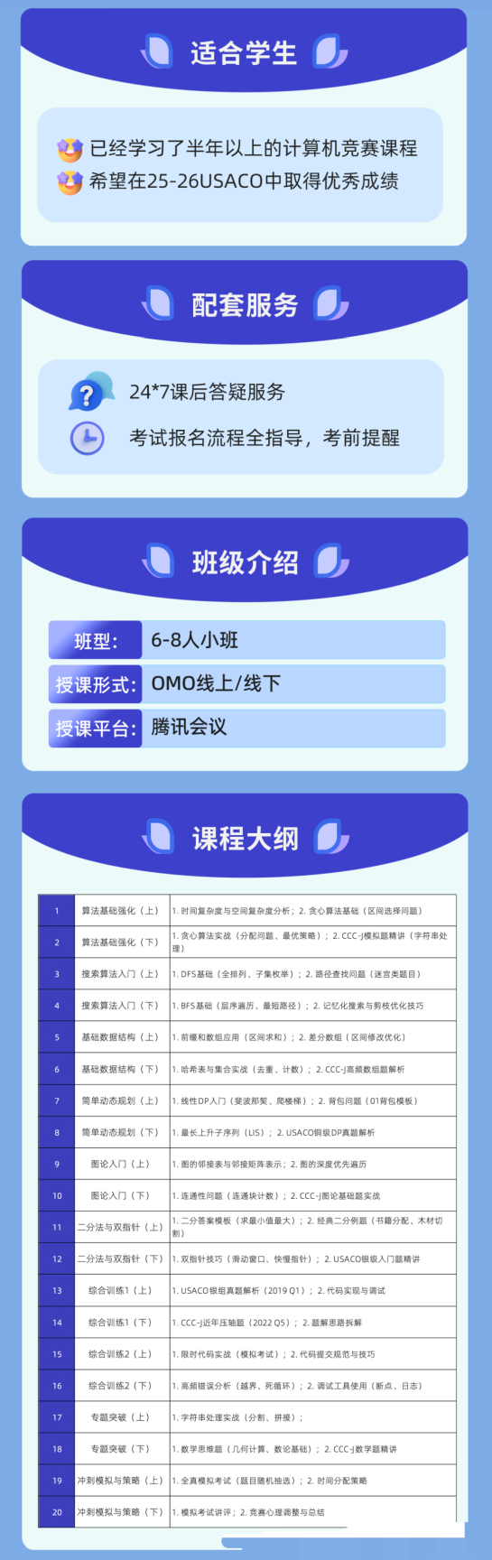 机构USACO计算机竞赛培训课程针对不同基础的学生,精心设计了从青铜到铂金的全程班、常规班、冲刺班等多种班型,以及铜升银、银升金、金升铂金等专项提升课程,课程语言有C++、Java、Python等专项辅导课程。