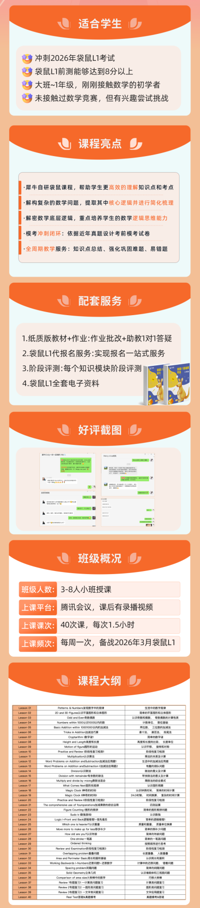 课程内容:教授学生数乘除法、四则运算等知识点特别针对L1级别的新增考点,如奇偶数、加减法巧算、数字谜题等,帮助学生全面掌握竞赛所需的数学知识。