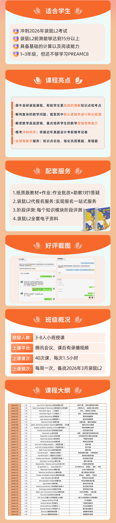 课程内容:教授学生袋鼠竞赛L2所有知识点,考前冲刺,历年真题练习答疑