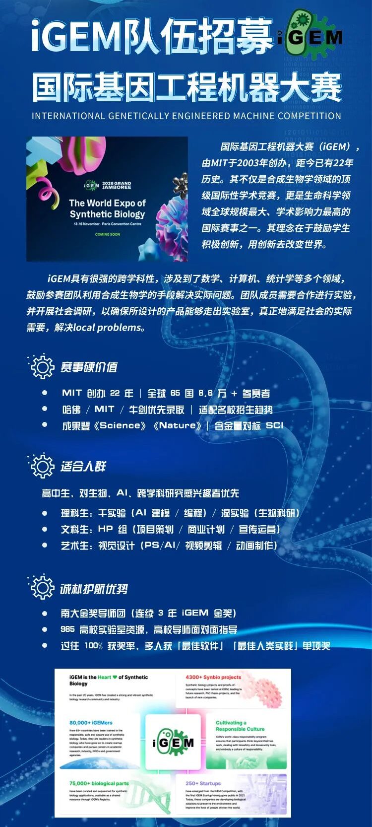 在当今科技迅猛发展的时代,有一项国际竞赛正以其独特的魅力吸引着全球越来越多的高中生参与——这就是iGEM(国际基因工程机器大赛)。作为合成生物学领域最具影响力的学术竞赛,iGEM不仅受到《Science》《Nature》等顶尖期刊的长期关注,更成为众多海外名校录取时的重要参考依据。