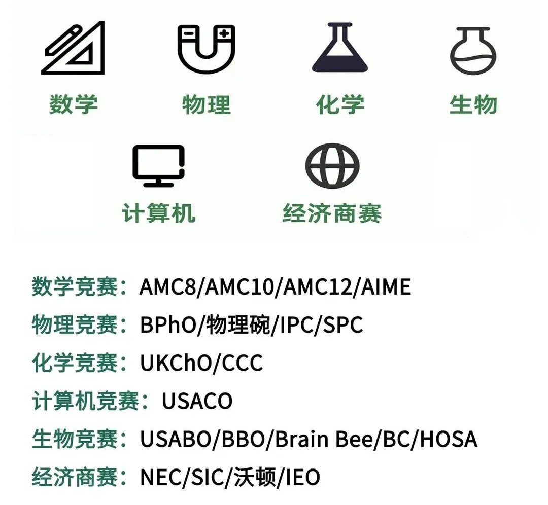机构国际教育提供数学、物理、化学、生物、计算机、经济商赛的课程: