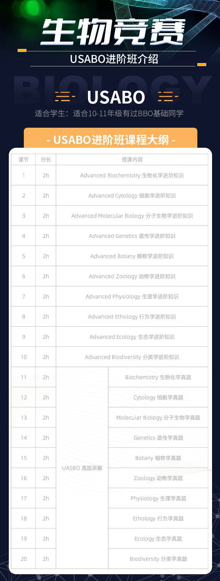 机构教育针对不同基础不同年级的学生分别开设了USABO基础班,进阶班,冲刺班,以及全程班等多种课程!