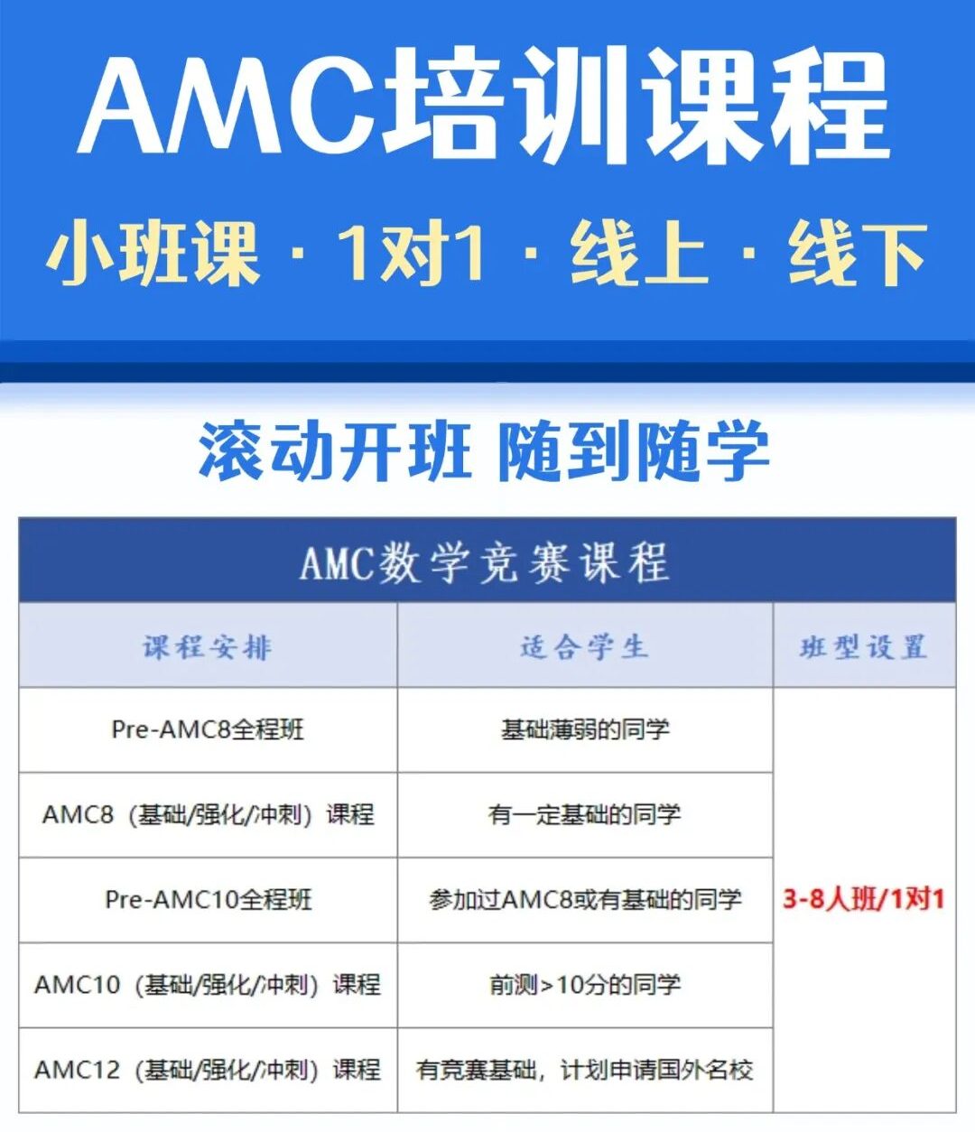 不知道如何选择适合自己的竞赛起点?机构AMC培训课程为您提供专业水平测评与个性化学习方案,并配备斯坦福名师全程指导,助大家稳步踏上通往1%之路👇