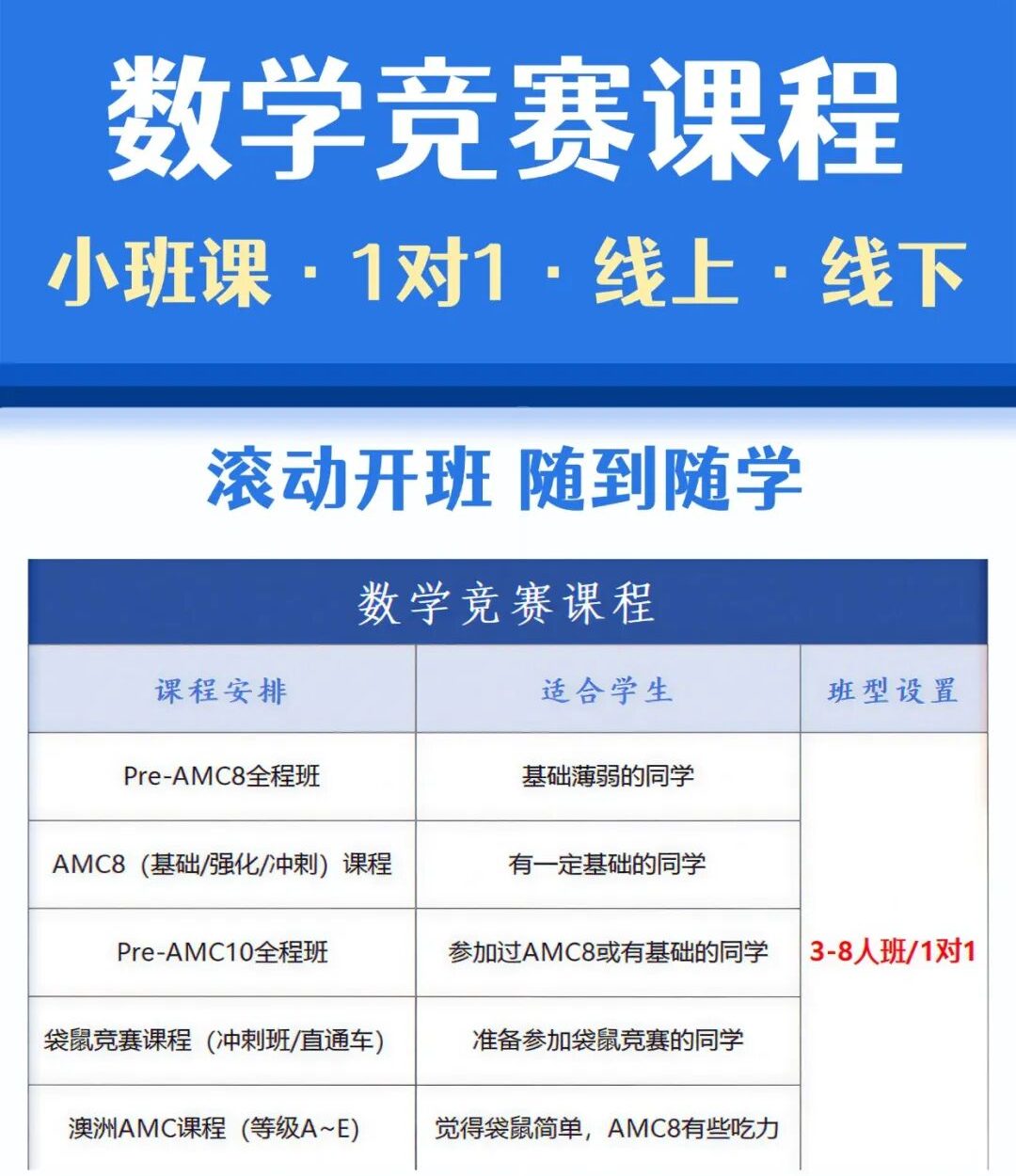 机构AMC10课程火热招生中……我们为不同基础的同学准备了针对性的课程方案。小班教学模式(3-8人班)确保每位学生都能获得充分的关注和个性化的指导👇