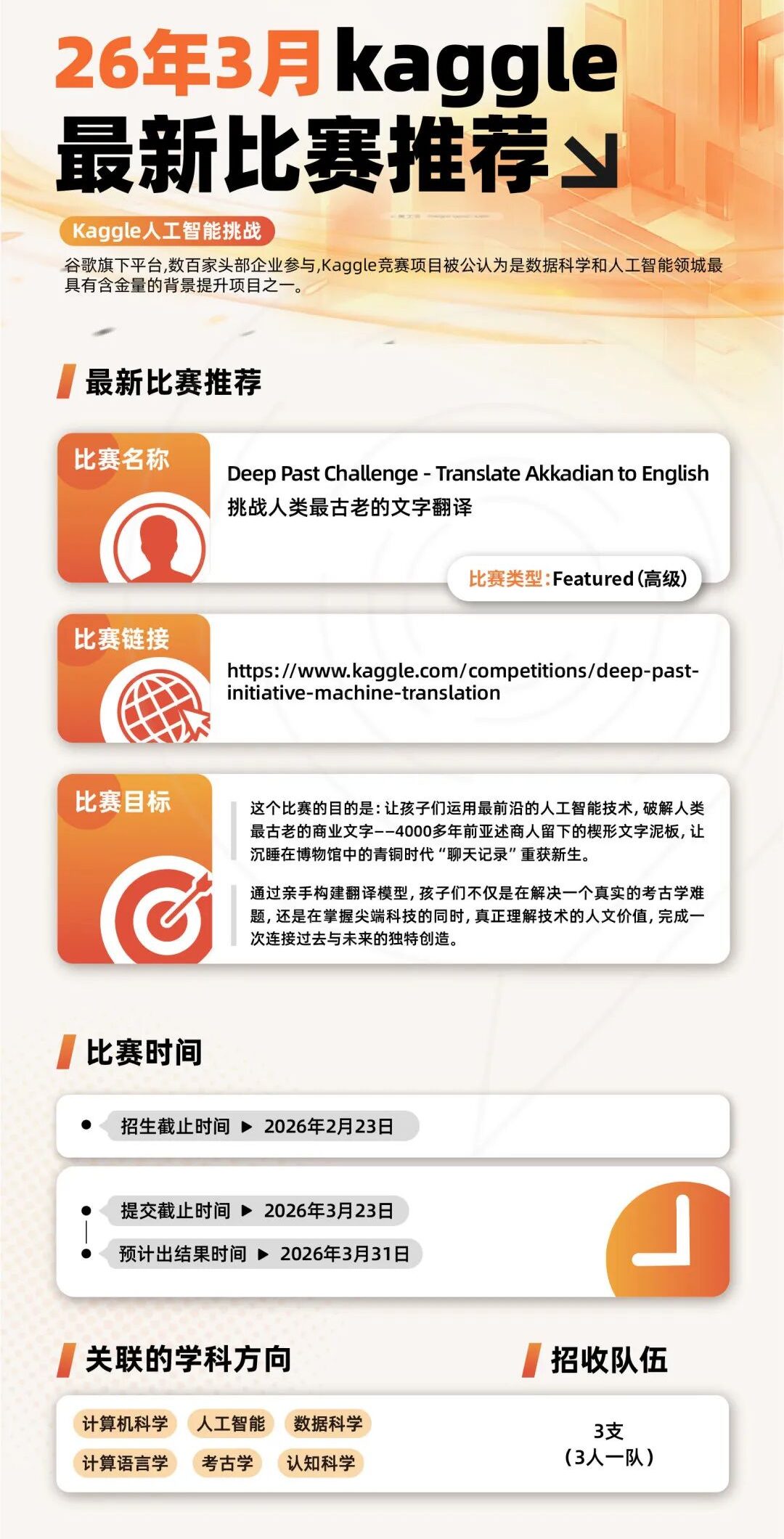 机构开设了多个Kaggle课题,适合不同专业的申请者,目前有两大AI交叉学科课题,适合CS/数据/数学/人文方向,是背景提升硬核机会,3人队招满即止,抓紧上车!