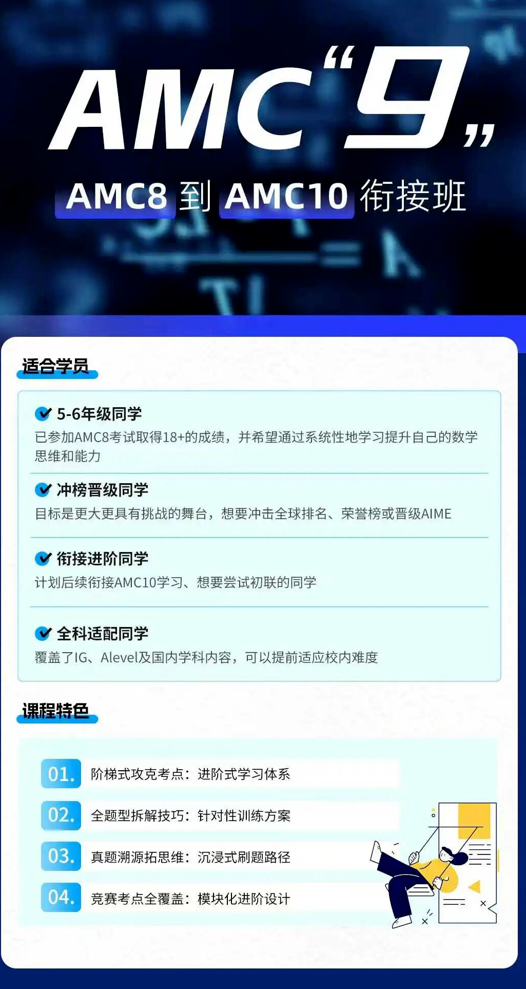 AMC“9”课程辅导,专为AMC8竞赛之后的孩子打造,丝滑衔接AMC10竞赛的黄金跳板!AMC9介于AMC8和AMC10之间的核心知识断层,更有助于5-8年级学生吸收消化高阶知识。