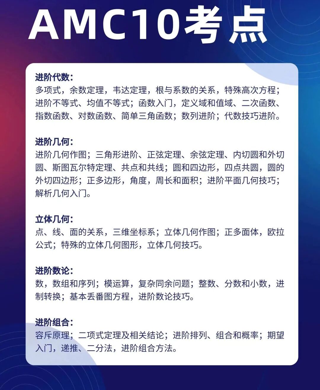 AMC10数学竞赛核心知识点基本覆盖国内初中全部内容,还会涉及少量高中基础内容,像基础函数、简单排列组合等。
