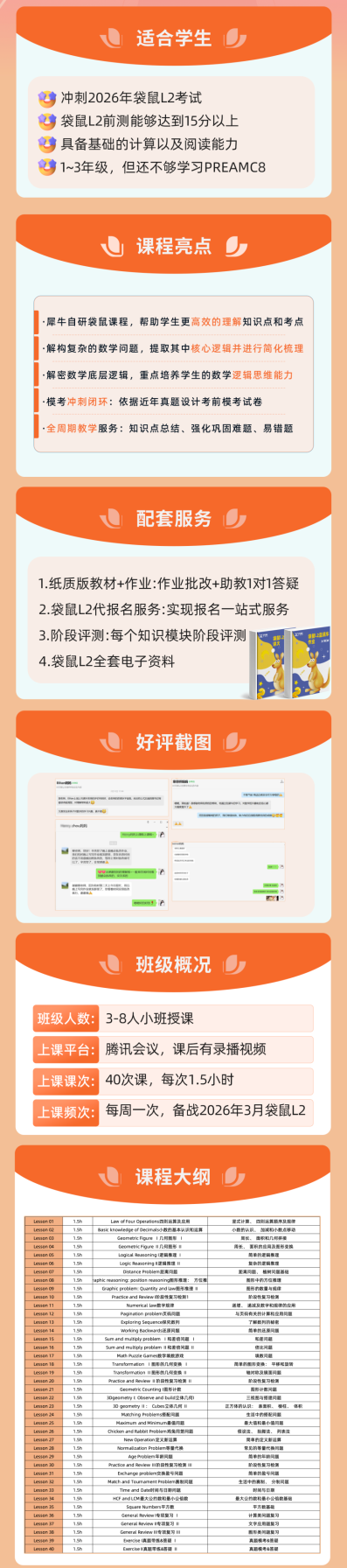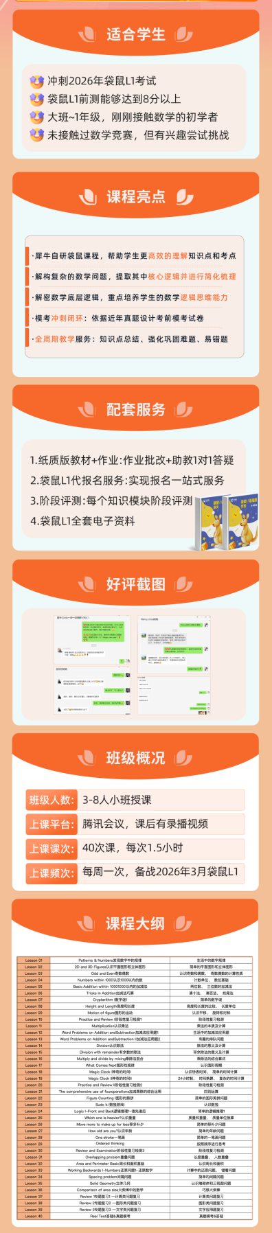 ✅课程内容:教授学生数乘除法、四则运算等知识点特别针对L1级别的新增考点,如奇偶数、加减法巧算、数字谜题等,帮助学生全面掌握竞赛所需的数学知识。