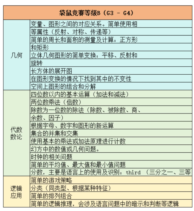 袋鼠数学竞赛总共有6个级别(A-F)每个级别考点均有差异