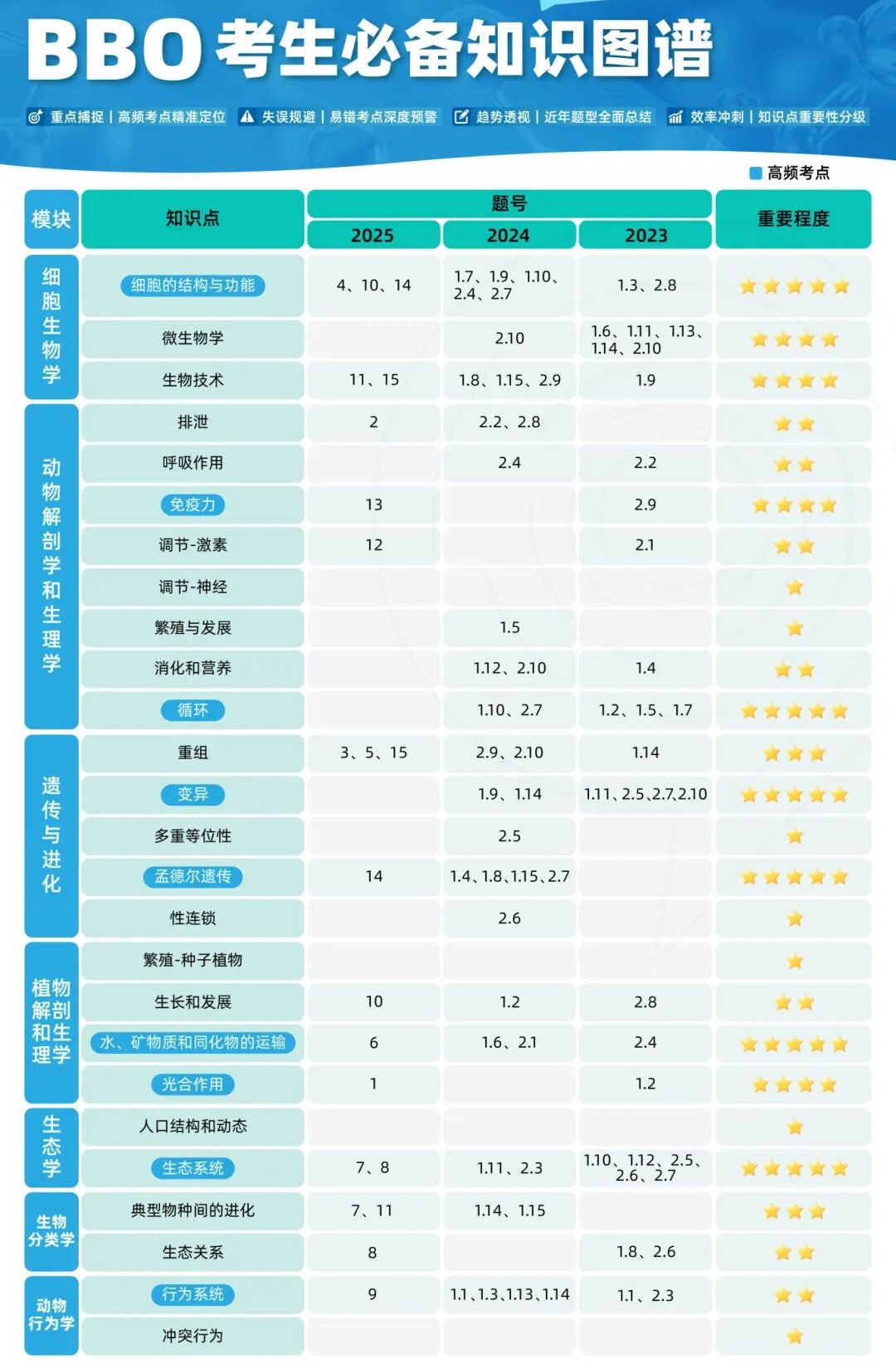 📝知识深度:USABO更侧重大学预科级深度,涉及分子生物学、神经生物学等高阶内容;BBO侧重基础广度,以高中生物知识为核心,仅少量延伸至大学入门内容。