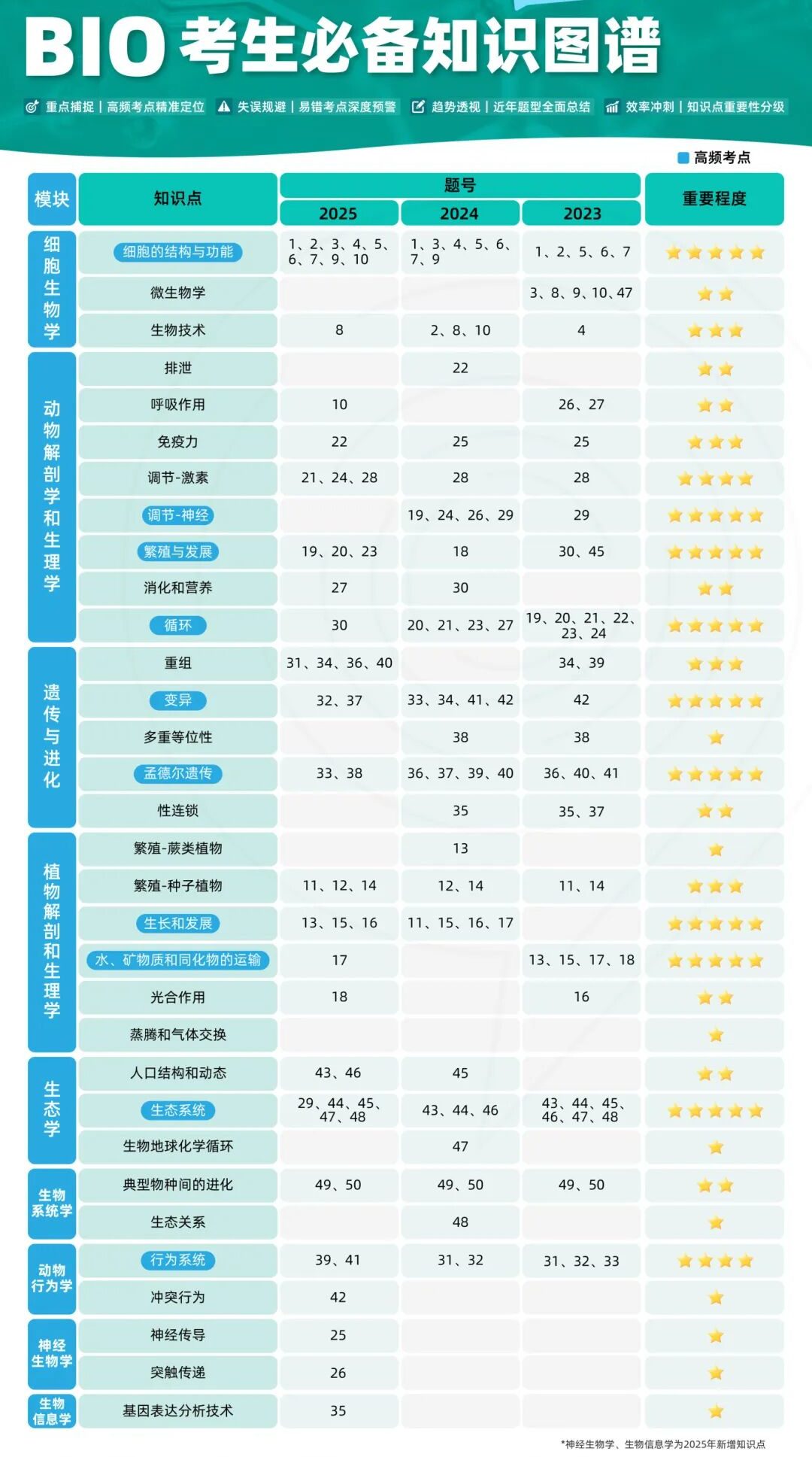 🔎具体模块:重点考察细胞生物学、分子遗传学、动物生理学,强调对概念的精准理解与逻辑推理。