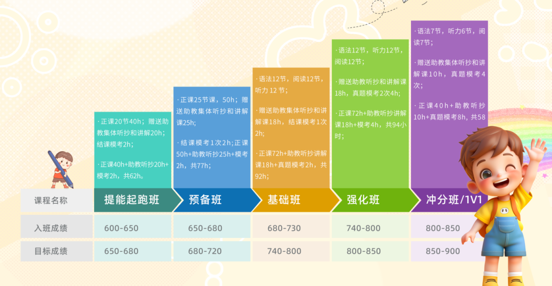 按基础分阶上课,提分更有针对性:课程覆盖基础班、强化班、冲刺班、全程班,精准适配娃的需求。